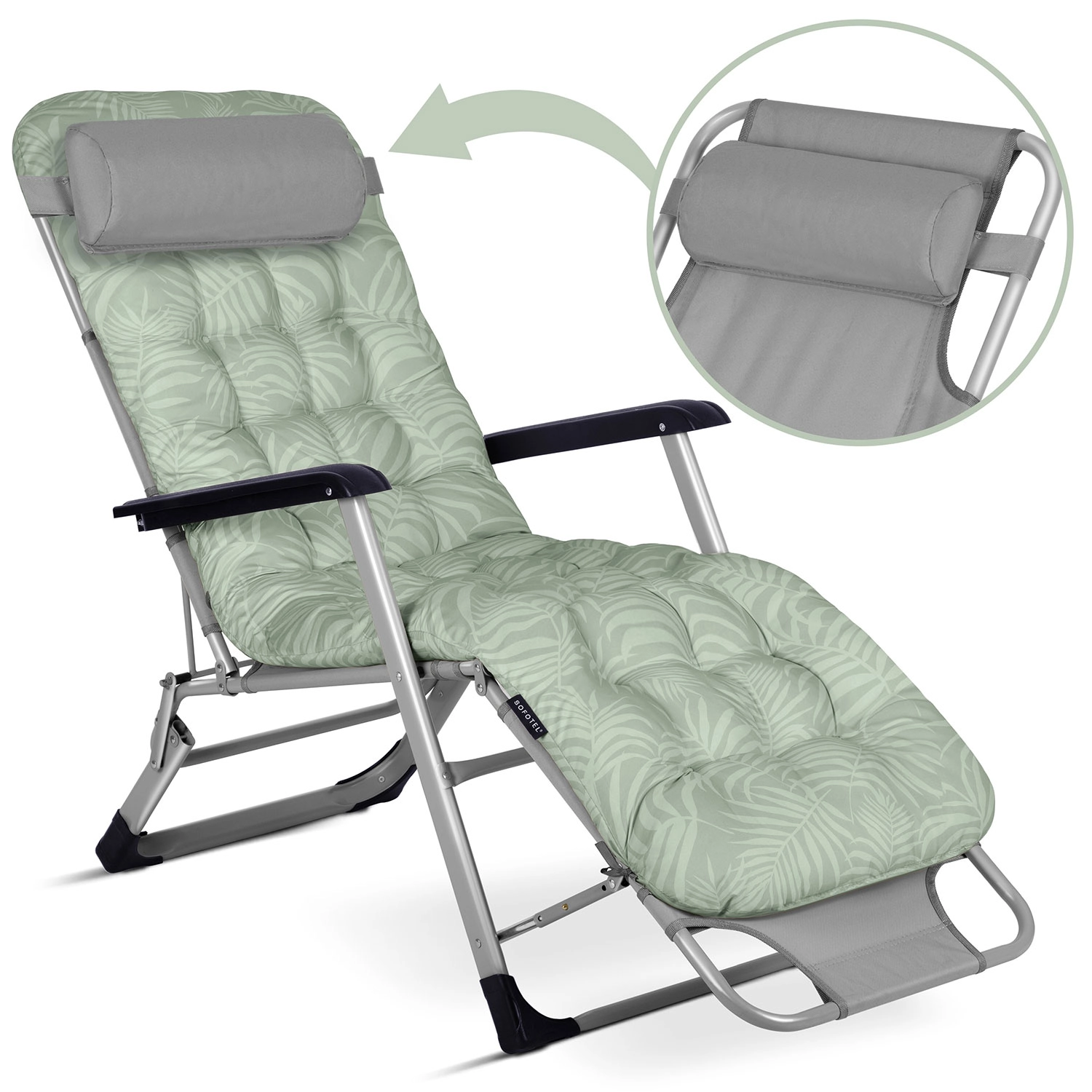 La chaise longue se plie rapidement en un format compact. Idéale pour le jardin, la terrasse et les vacances – elle tient aisément dans le coffre de la voiture.