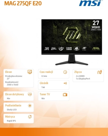 Le moniteur MAG 275QF E20 est un excellent choix pour les joueurs comme pour les utilisateurs exigeants. La résolution WQHD (2560 × 1440) apporte davantage de détails et d’espace de travail, tandis que le taux de rafraîchissement 200 Hz garantit une fluidité exceptionnelle sans déchirement d’image. L’écran plat avec rétroéclairage LED offre des couleurs fidèles et une grande luminosité pour un usage quotidien.