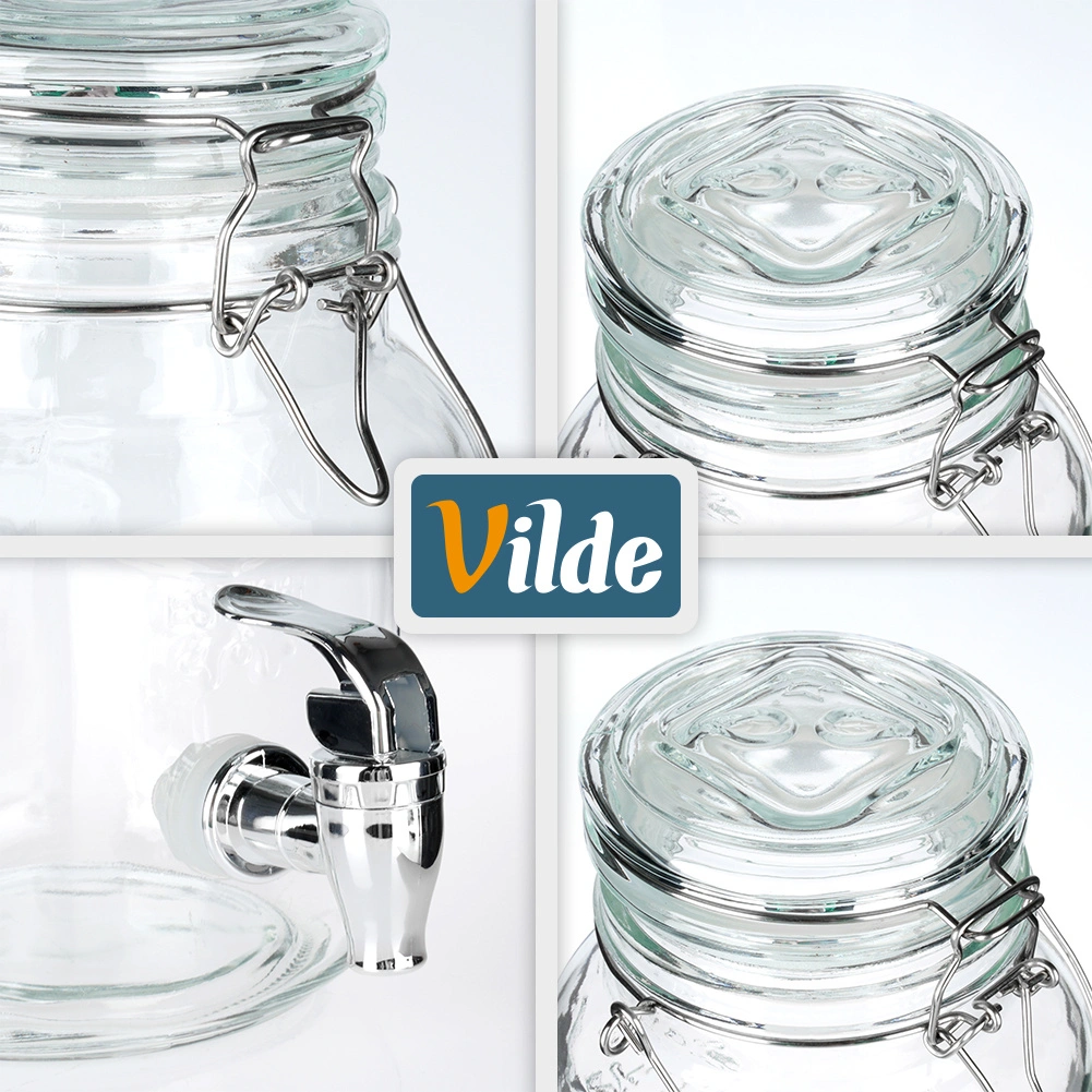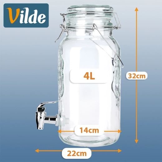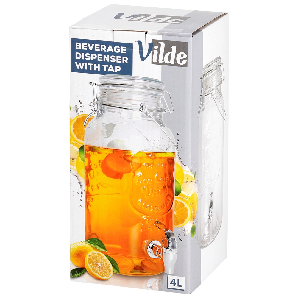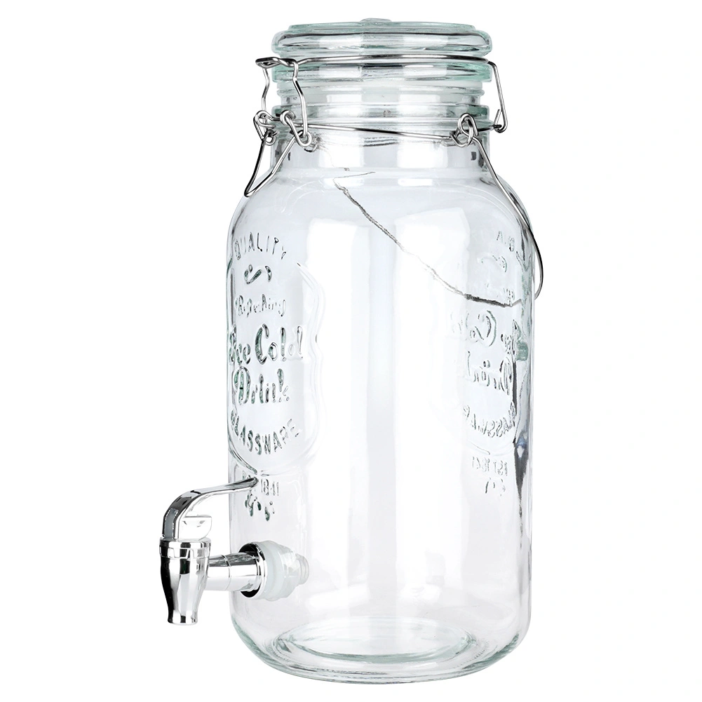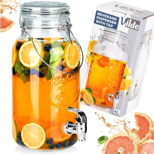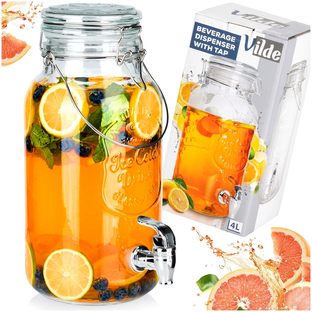 Distributeur de boissons en verre élégant de 4 l avec robinet métallique et couvercle hermétique, idéal pour servir de la limonade, de l’eau fruitée, du punch ou du thé glacé. Grâce à son large goulot, il se remplit et se nettoie facilement, sa poignée solide facilite le transport et la fermeture à clip protège la boisson des insectes.