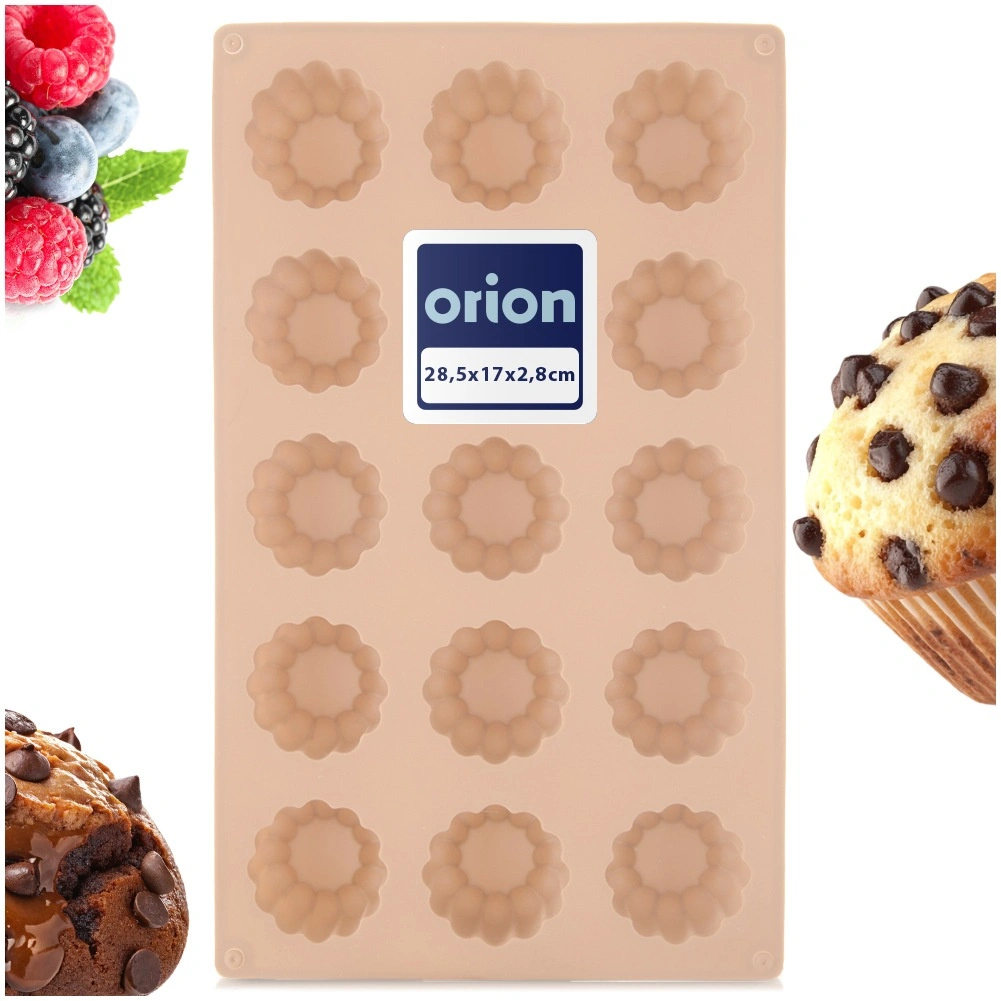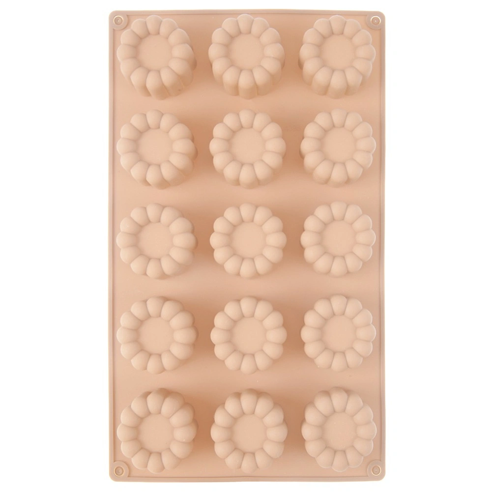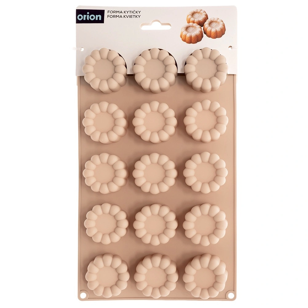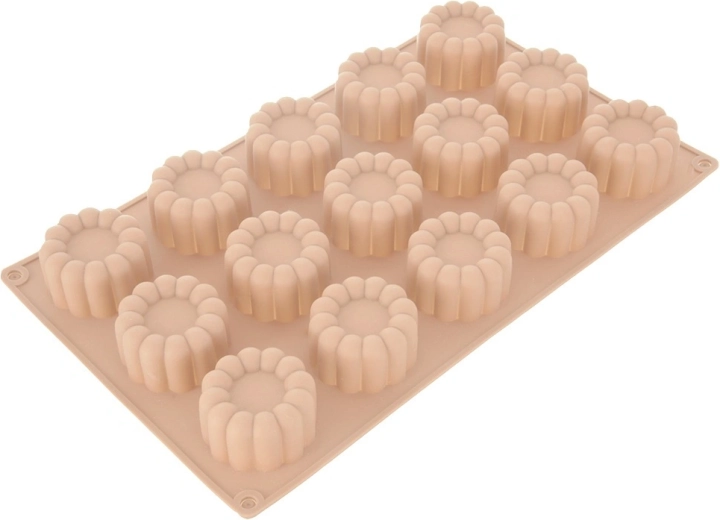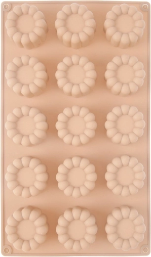 Moule en silicone pratique de couleur beige pour cuire en une seule fois jusqu’à 15 pièces en forme de fleur. Grâce au matériau flexible, le démoulage est facile, la pâte n’adhère pas et le moule est résistant de -40 °C à +200 °C. Compatible avec le four, le micro-ondes, le congélateur et le lave-vaisselle – idéal pour biscuits, pralines, chocolats et mini desserts.