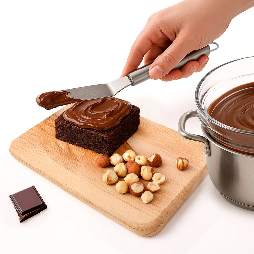 La lame étroite, longue et légèrement décalée garantit une application uniforme des crèmes et glaçages même sur les petits gâteaux et cupcakes.