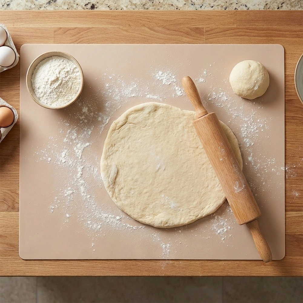 La pâte ne colle pas au tapis et nécessite un minimum de farine. Idéal pour tartes, biscuits et pizza – un travail propre sans désordre.