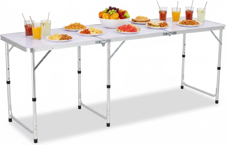 La table de camping pliante de 180 × 60 cm est un choix fiable pour les fêtes de jardin, le camping, les festivals et l’usage domestique. Grâce à ses trois réglages de hauteur (55/62/70 cm), vous l’adaptez facilement pour les repas, la préparation des aliments ou le travail en extérieur. La structure en acier robuste et le plateau en MDF résistant garantissent stabilité et longévité.
