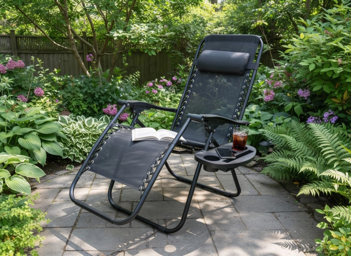 Un plateau pratique avec porte-boisson et emplacement pour téléphone ou livre garde tout à portée de main – idéal pour se relaxer sur la terrasse ou au jardin.
