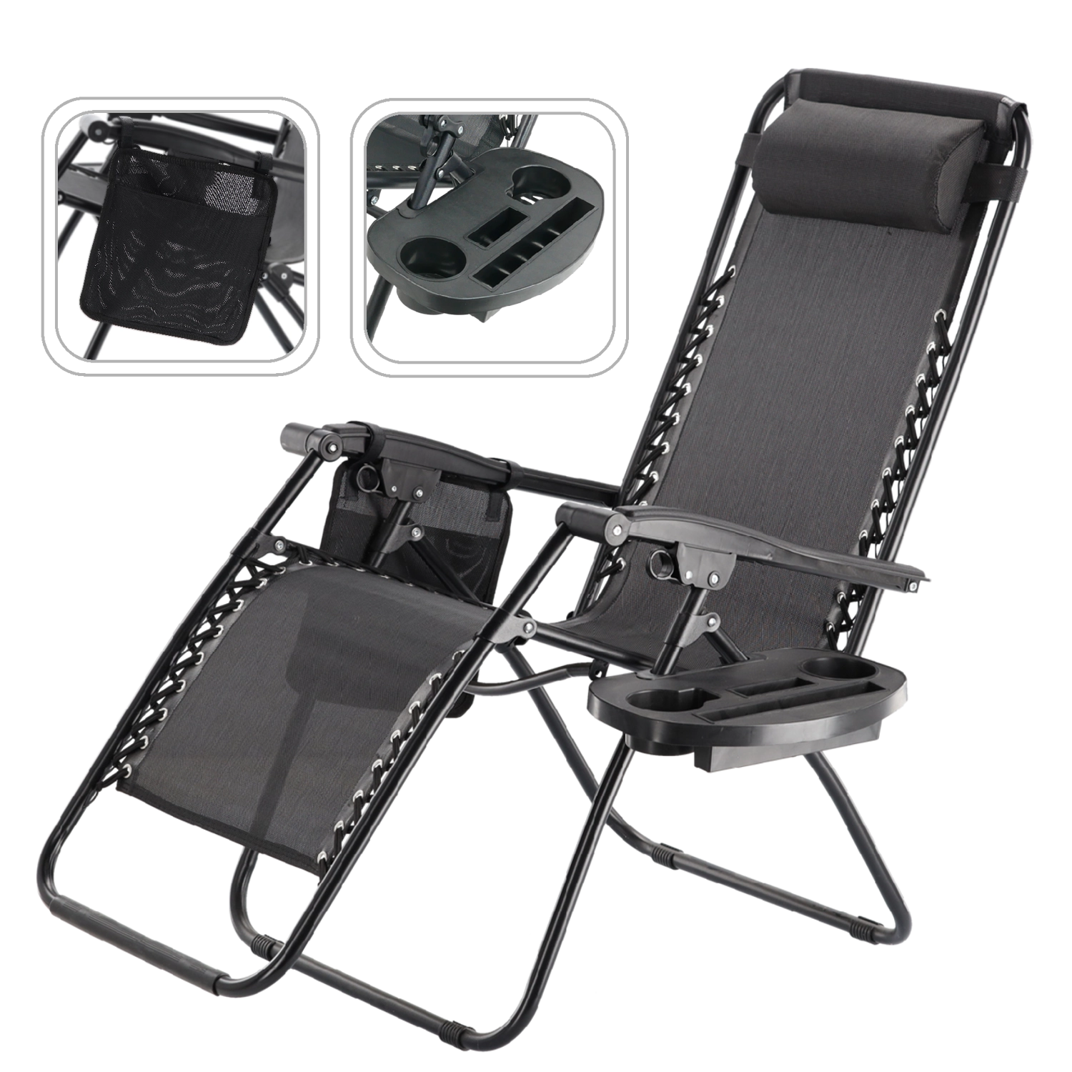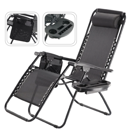 La chaise longue de jardin pliante noire est conçue pour une détente maximale. Le cadre en acier robuste avec suspension par cordage et la maille respirante offrent une souplesse agréable, tandis que la tablette latérale amovible avec porte-boisson et ses compartiments gardent tout à portée de main. Grâce au dossier et au repose-pieds réglables, passez aisément de la position assise à la position allongée.