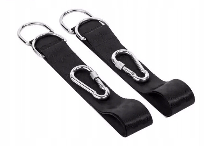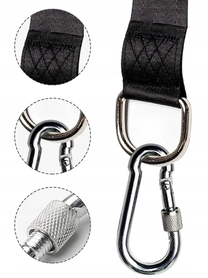 Des sangles solides avec anneaux en D métalliques et mousquetons à vis offrent une sécurité même sous de fortes charges jusqu’à 1000 kg.