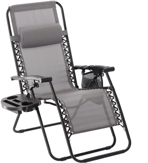 La pratique tablette latérale avec porte-boissons et espace pour le téléphone ou un livre garde tout à proximité. Une poche latérale offre un espace supplémentaire pour des lunettes, un magazine ou une crème solaire. Le cadre métallique stable et les multiples inclinaisons assurent le confort pour la lecture comme pour la sieste.