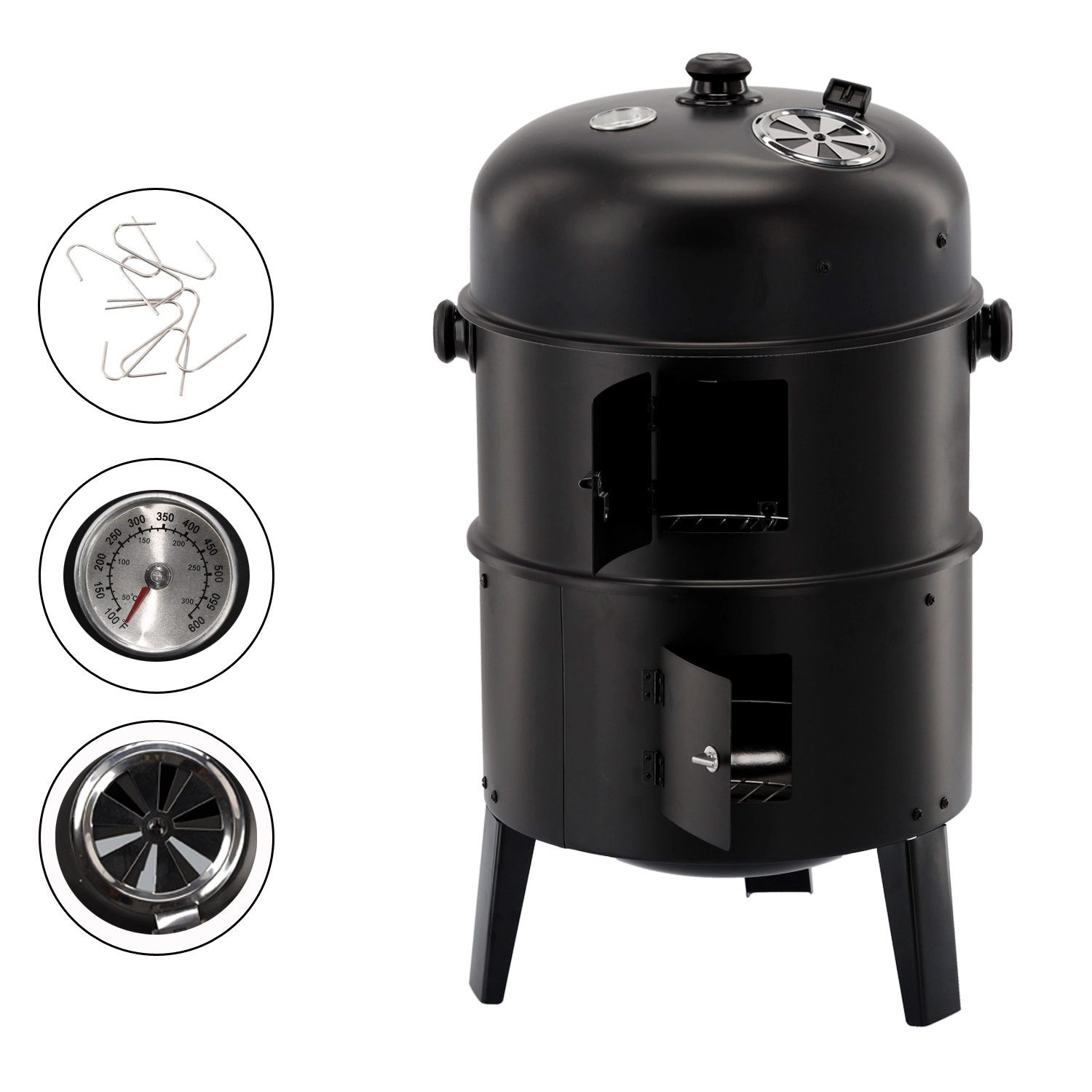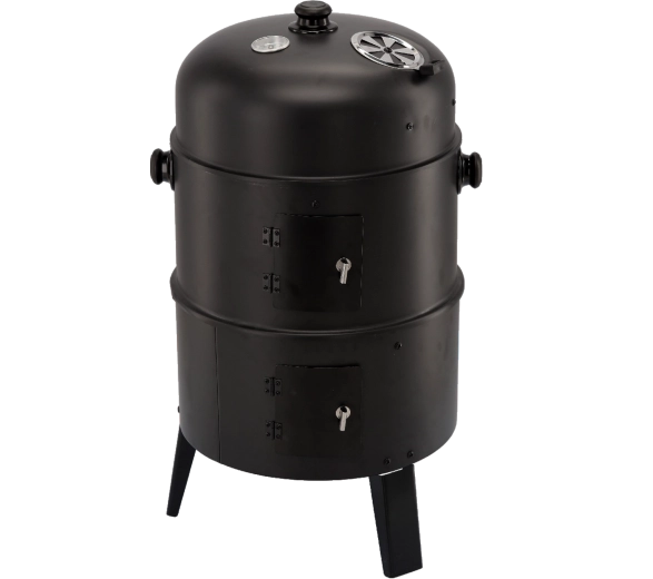 Ce grill/fumoir à charbon vertical propose deux niveaux de grilles (Ø 37 cm) pour préparer plusieurs plats simultanément et des portes frontales doubles pratiques pour recharger le combustible ou vérifier les aliments. Le thermomètre intégré au dôme et la ventilation réglable permettent de maintenir une température stable pour le fumage lent comme pour la grillade classique.