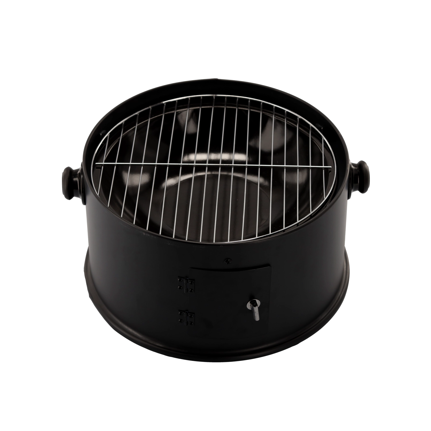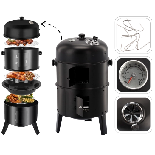 La structure métallique robuste avec sections pliables/amovibles facilite le transport et le nettoyage. Sont inclus des crochets pour fumer et deux cuvettes émaillées – bac à eau et foyer avec grille – pour des résultats plus juteux et un fonctionnement plus propre. Un choix parfait pour le jardin, la terrasse ou le pique-nique.