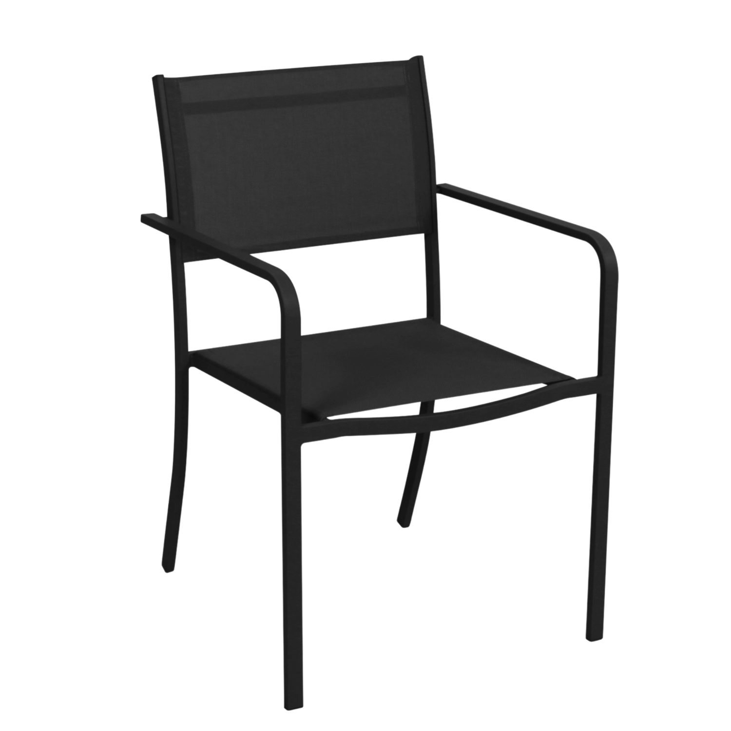 Chaise de jardin noire avec accoudoirs, cadre en acier et assise en textile