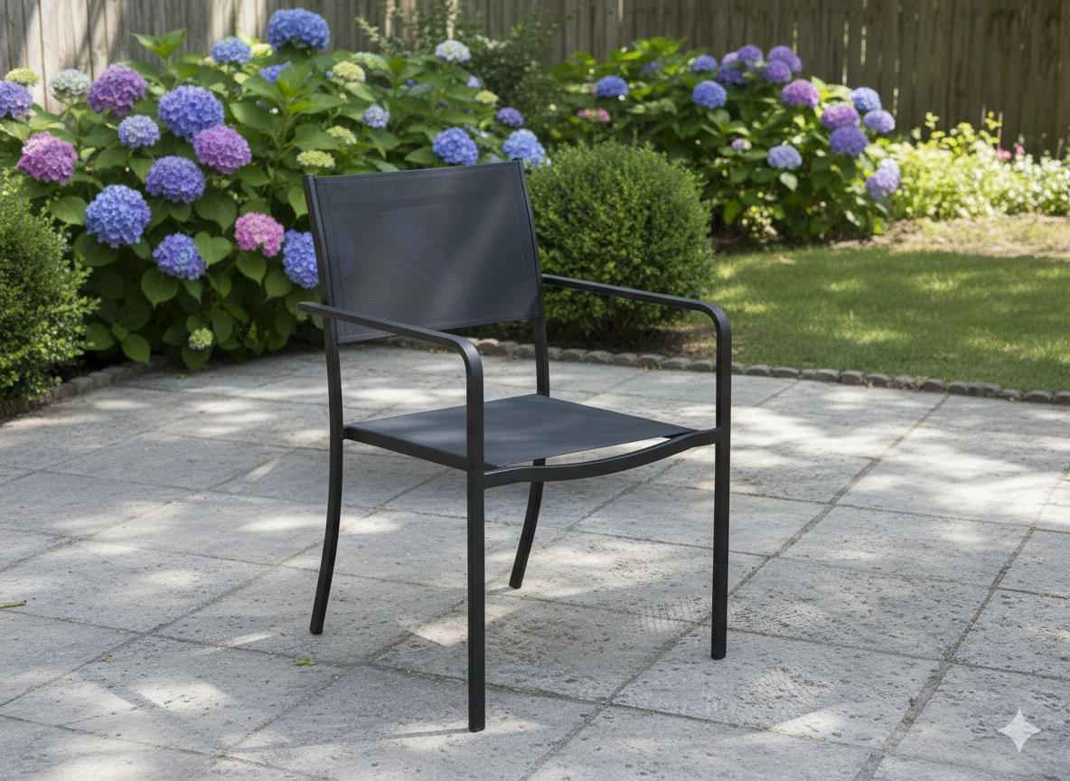 Cette chaise de jardin noire, élégante et résistante, allie design minimaliste, confort et praticité. Sa structure en acier avec revêtement par poudre assure stabilité et résistance aux intempéries, tandis que le textilène 2×1 respirant sèche rapidement et reste agréable à l’assise. Grâce à son design empilable, vous gagnez de la place lors du rangement – idéale pour la terrasse, le balcon et les cafés de jardin.