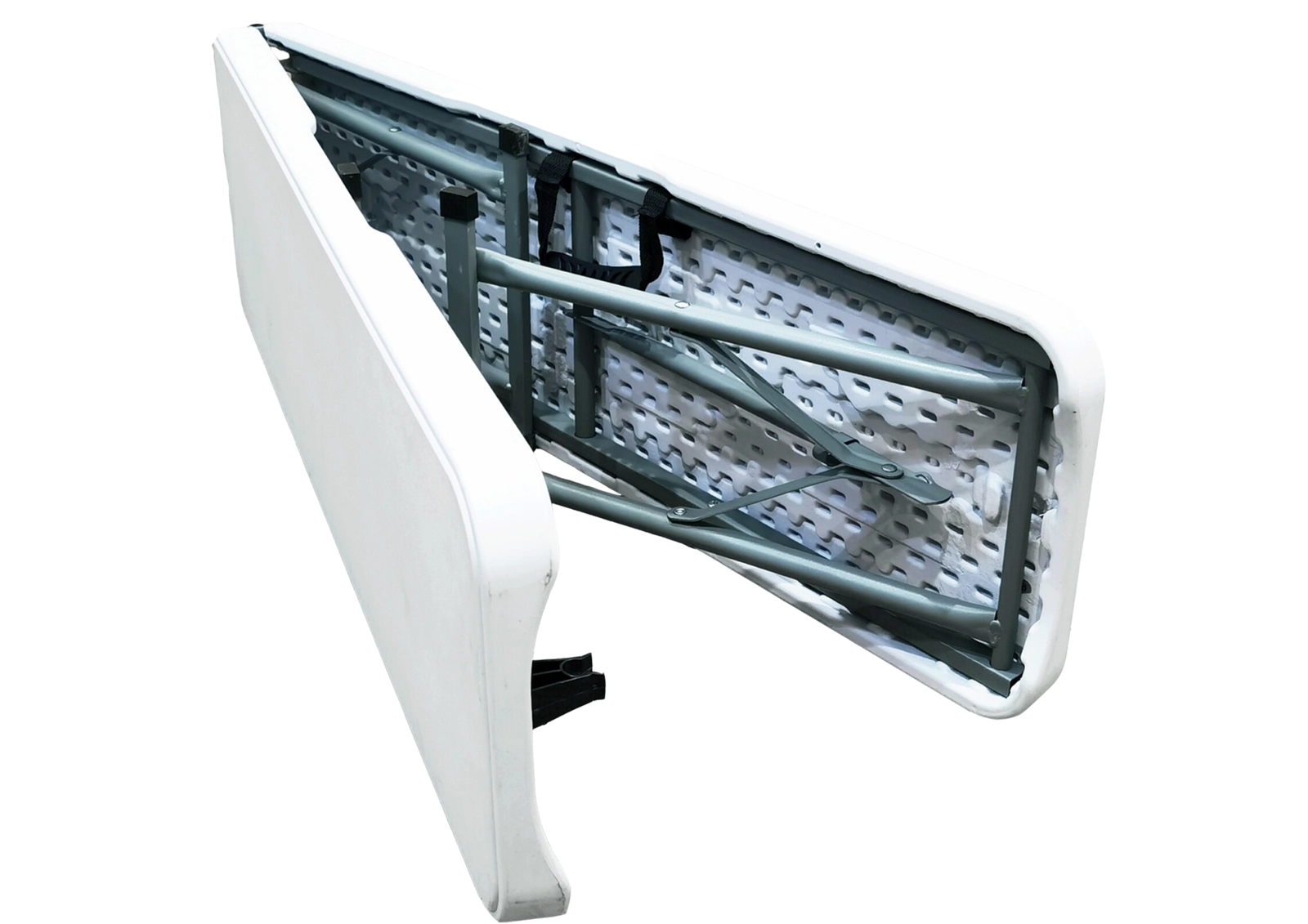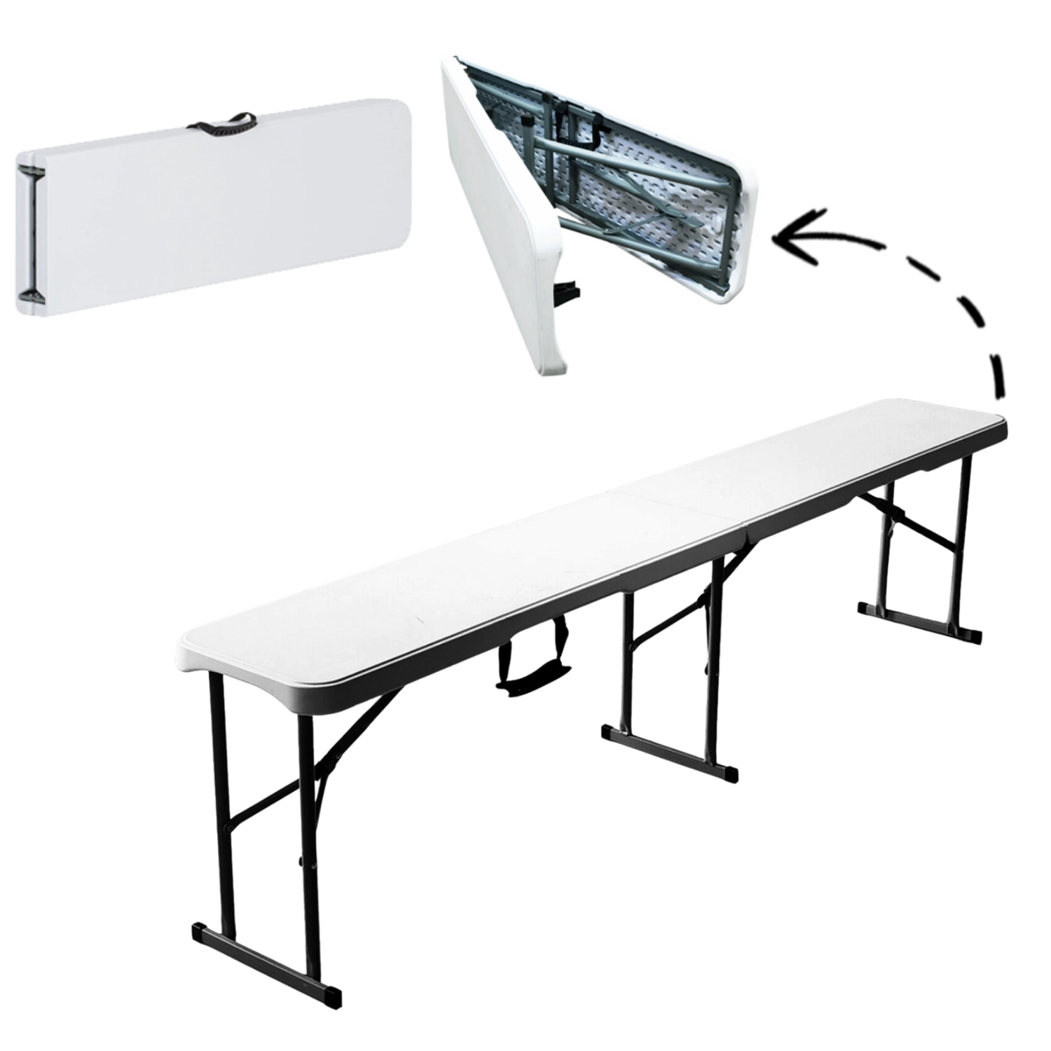 Ce banc pliant polyvalent de 180 cm offre une assise confortable pour 2 à 3 personnes. Son plateau en HDPE durable et ses pieds en acier robustes avec renforts garantissent une excellente stabilité en intérieur comme en extérieur. Une fois plié en deux et sécurisé par une sangle, il se transporte aisément grâce à sa poignée pratique et se range même dans de petits espaces.