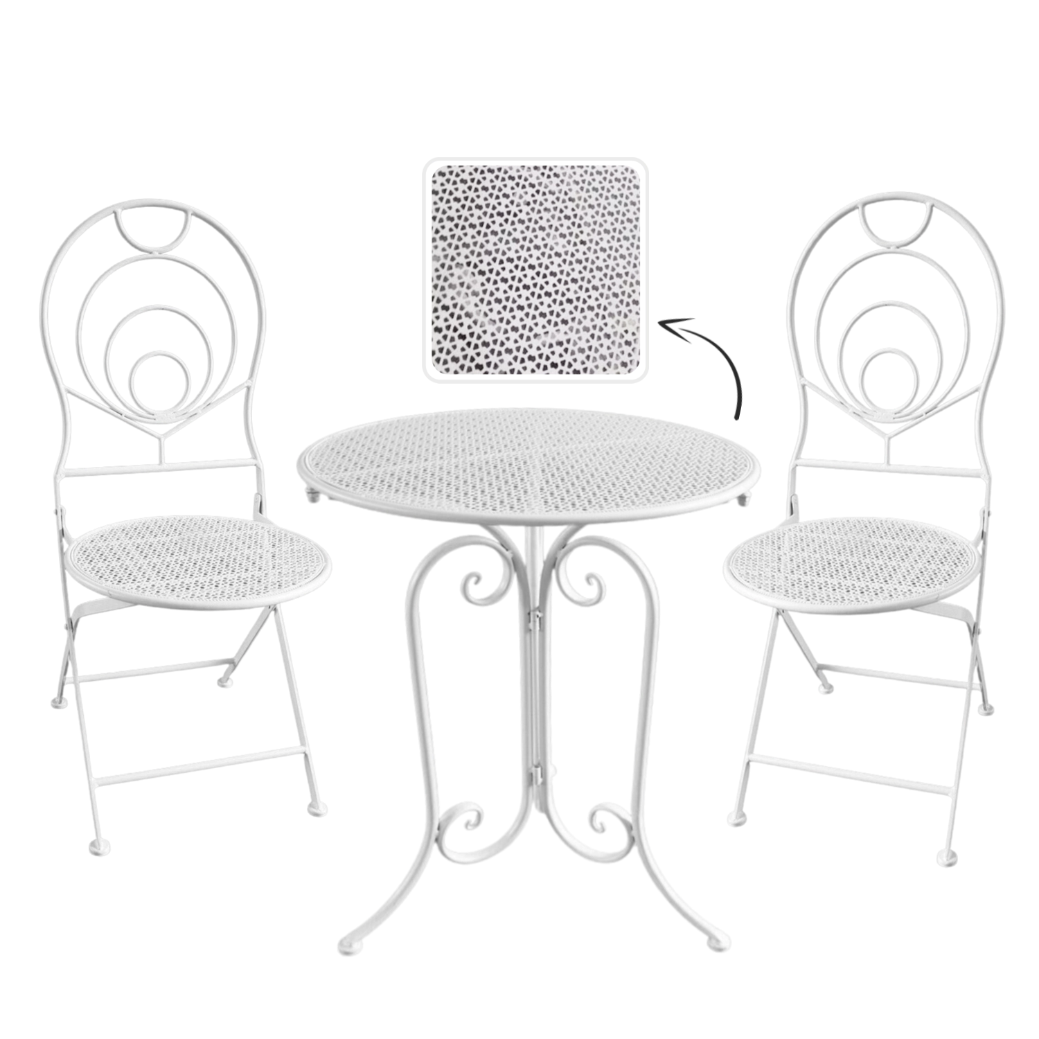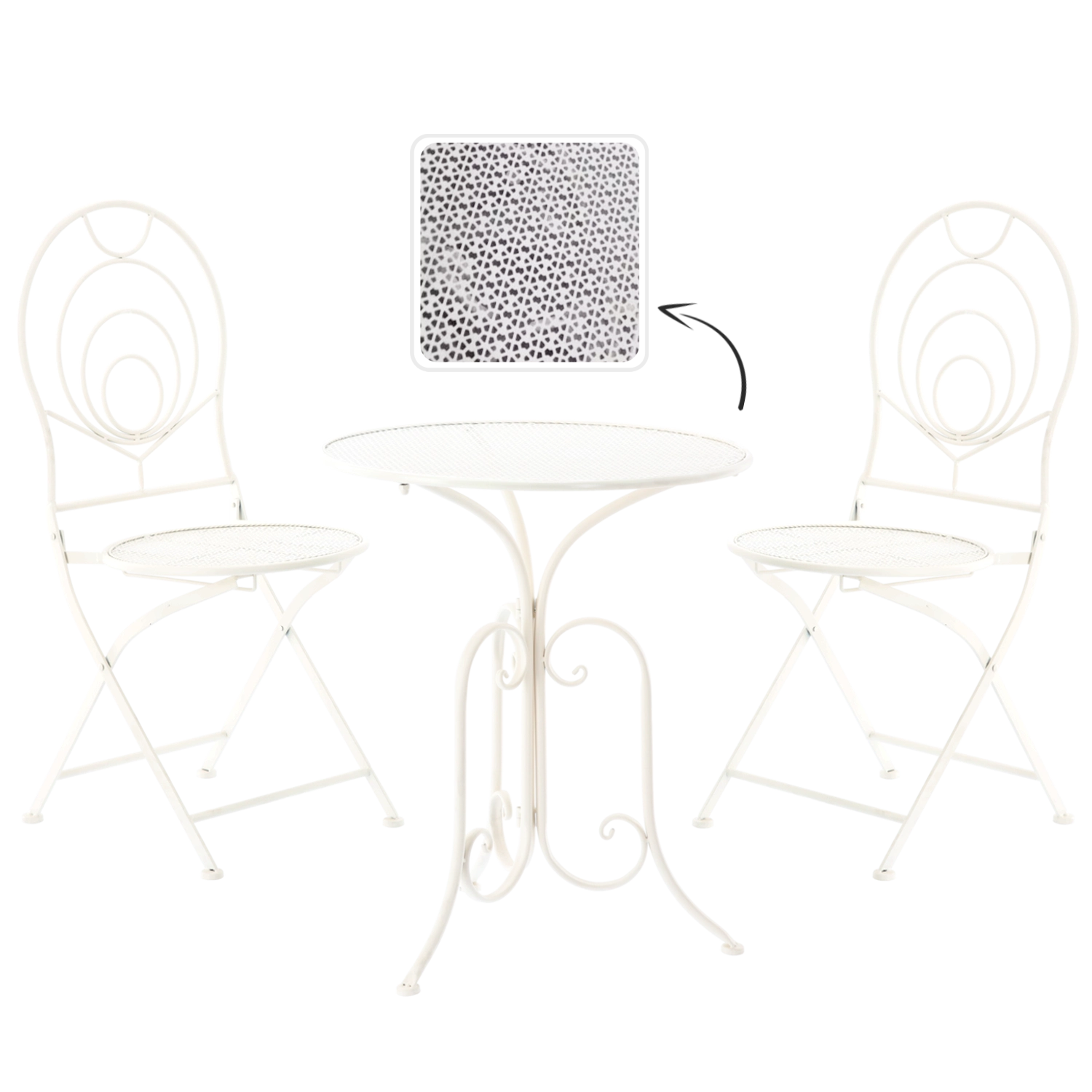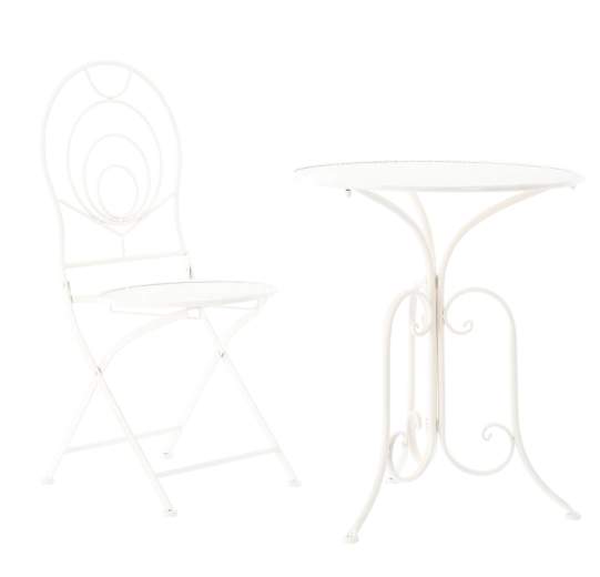 Les chaises sont pliantes, ainsi après une pause-café vous rangez rapidement l’ensemble même dans un espace réduit. La table ronde offre une surface pratique pour les boissons ou la déco. Grâce à sa couleur blanche universelle et à son ornementation rétro, l’ensemble convient aux jardins, cafés et intérieurs de style vintage.