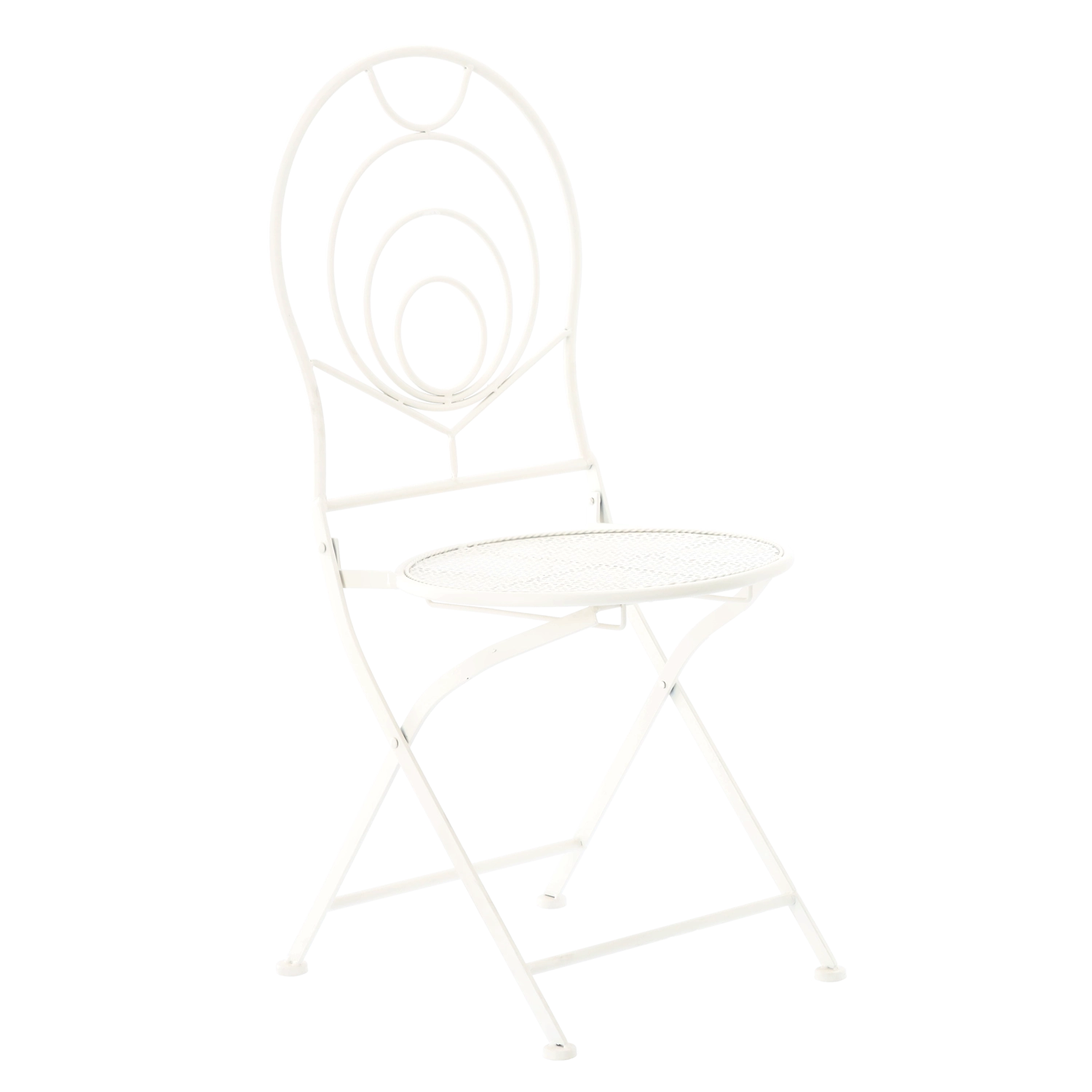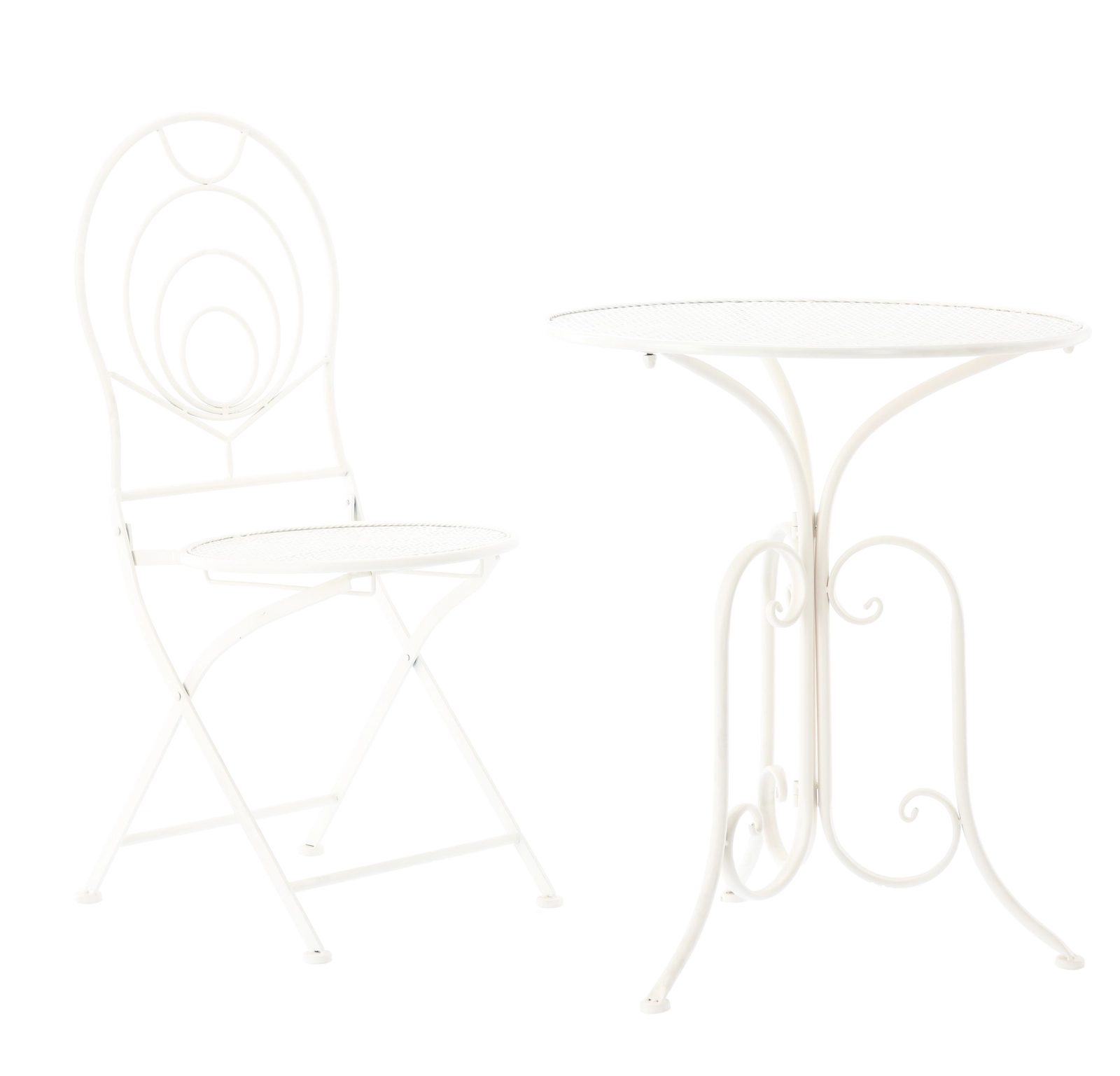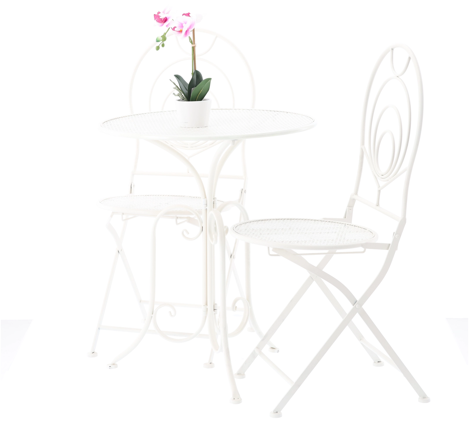 Les chaises sont pliantes, ainsi après une pause-café vous rangez rapidement l’ensemble même dans un espace réduit. La table ronde offre une surface pratique pour les boissons ou la déco. Grâce à sa couleur blanche universelle et à son ornementation rétro, l’ensemble convient aux jardins, cafés et intérieurs de style vintage.