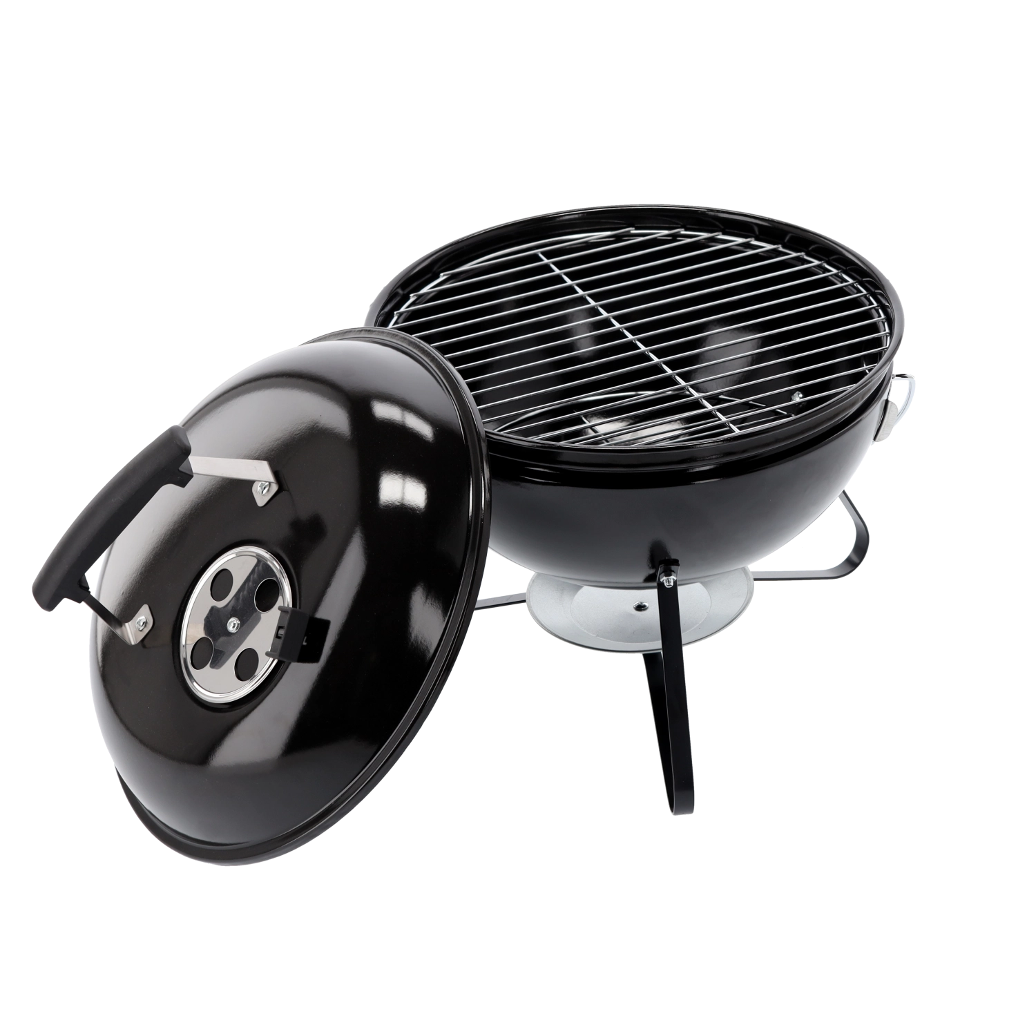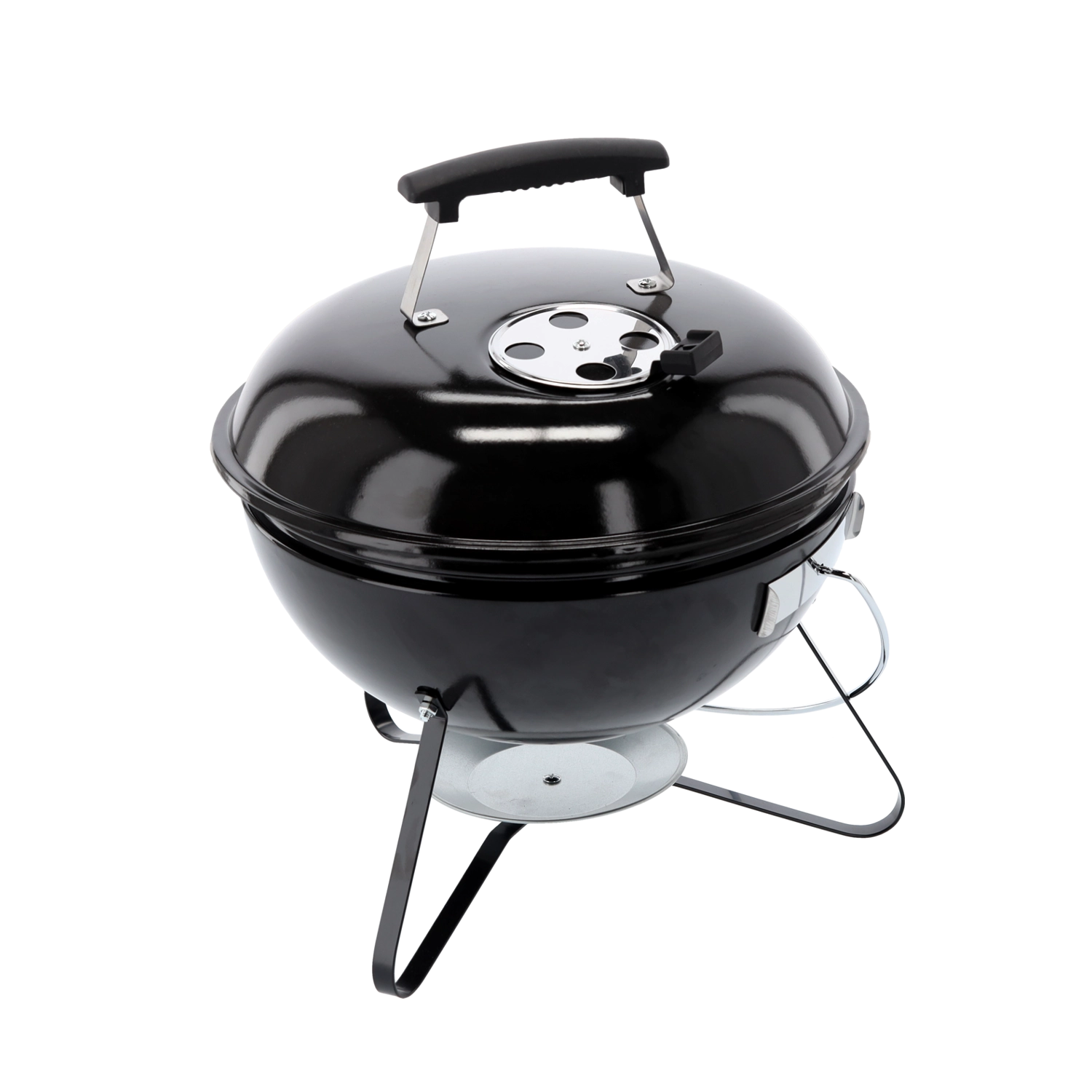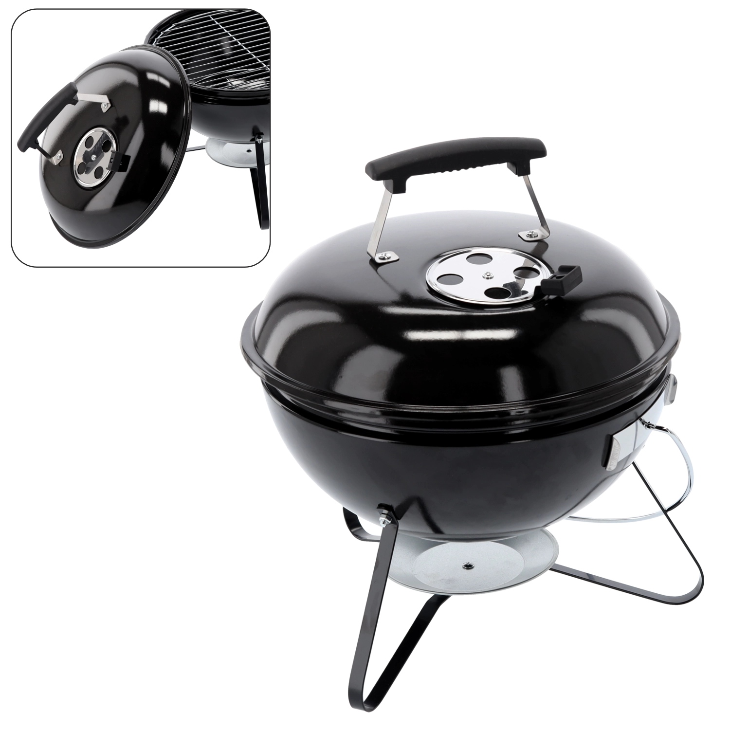 Barbecue boule compact au charbon de bois, diamètre 37 cm, idéal pour le jardin, le balcon et les pique-niques. Il offre une construction légère et portable, un couvercle émaillé pour une meilleure circulation de la chaleur et un trépied stable pour griller en toute sécurité partout.
