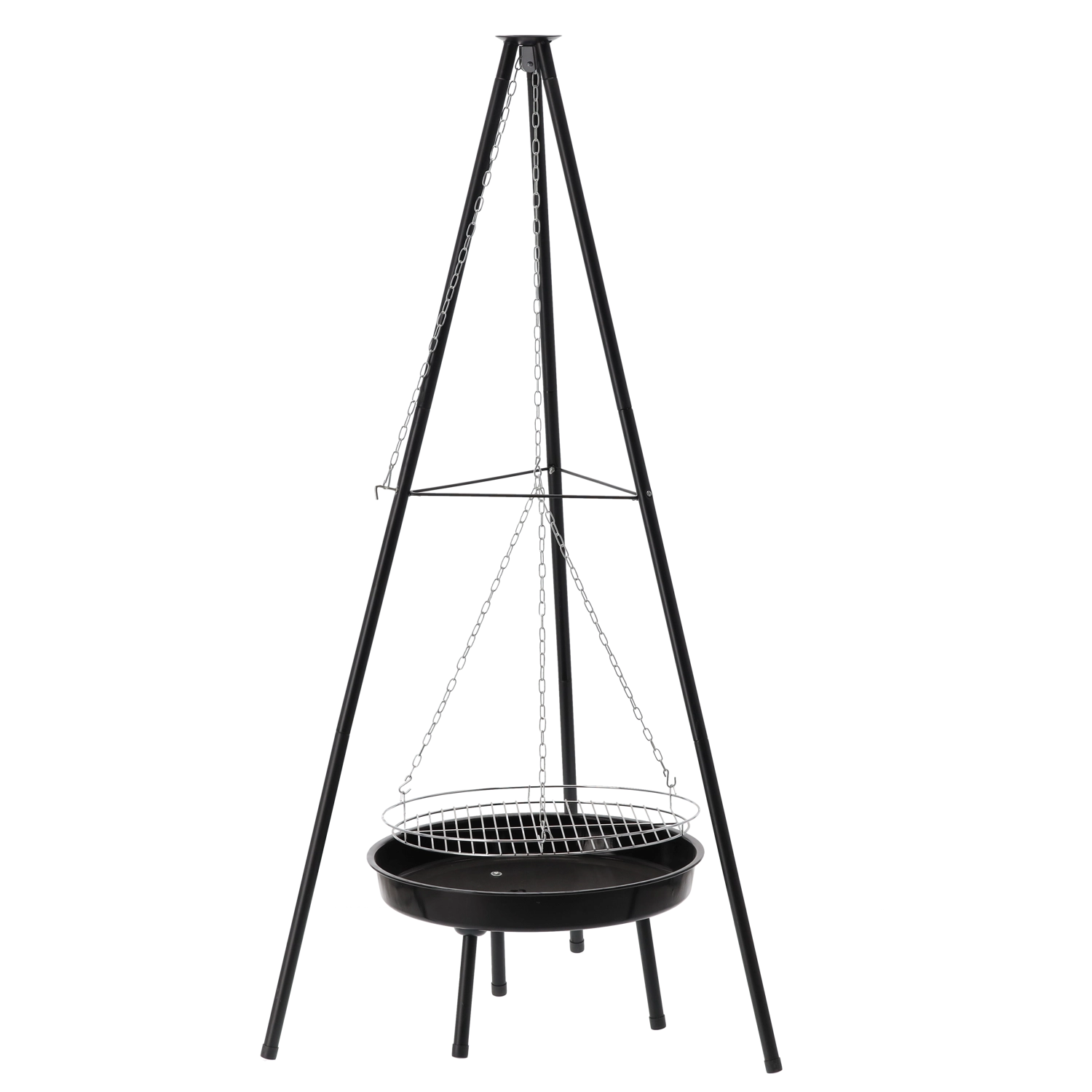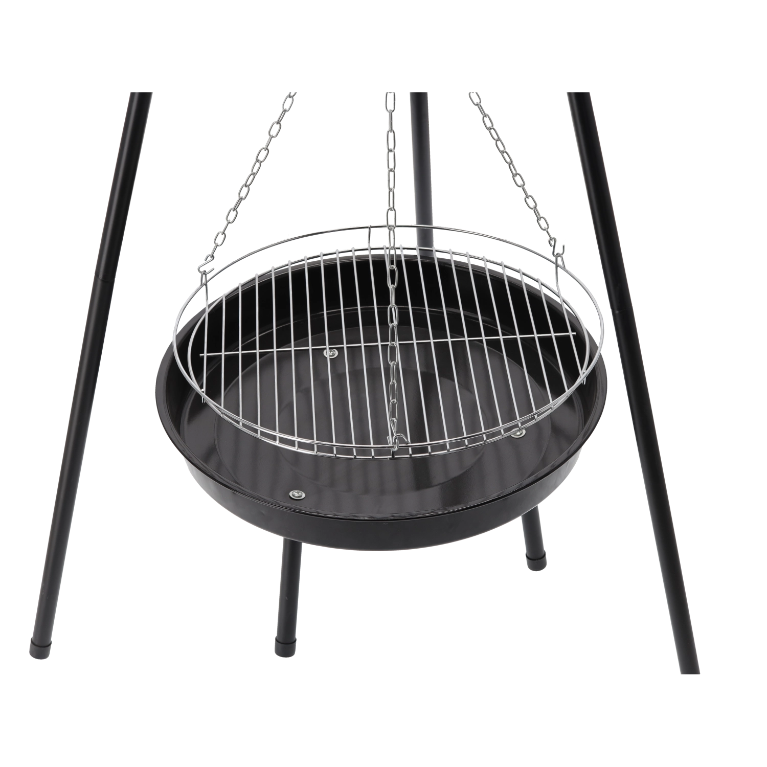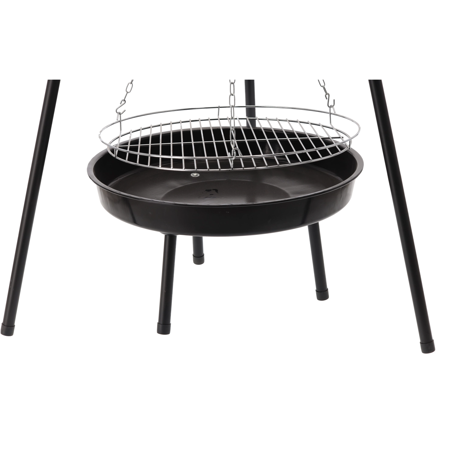 Ce grill d’extérieur sur trépied combine la liberté de la cuisson sur braises ardentes avec des détails pratiques pour un usage quotidien. La grille chromée de 49,5 cm de diamètre suspendue par des chaînes assure une chauffe homogène et un réglage facile de la hauteur au-dessus du feu. La cuve du brasero émaillée de 50 cm de diamètre est résistante, facile à nettoyer et conserve la chaleur longtemps.