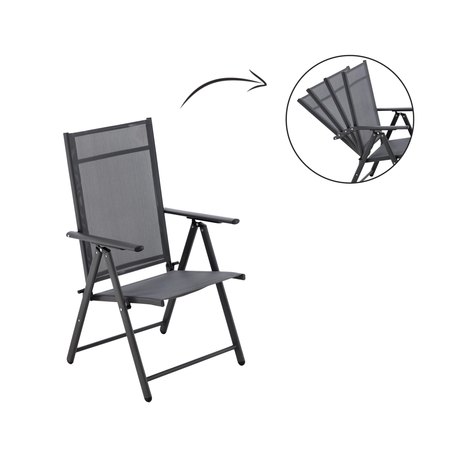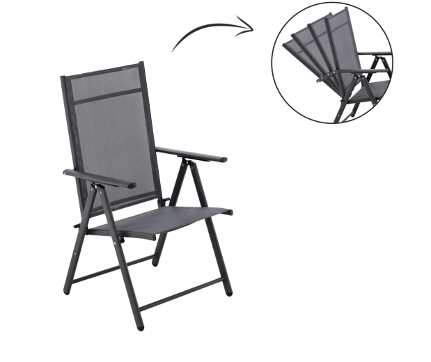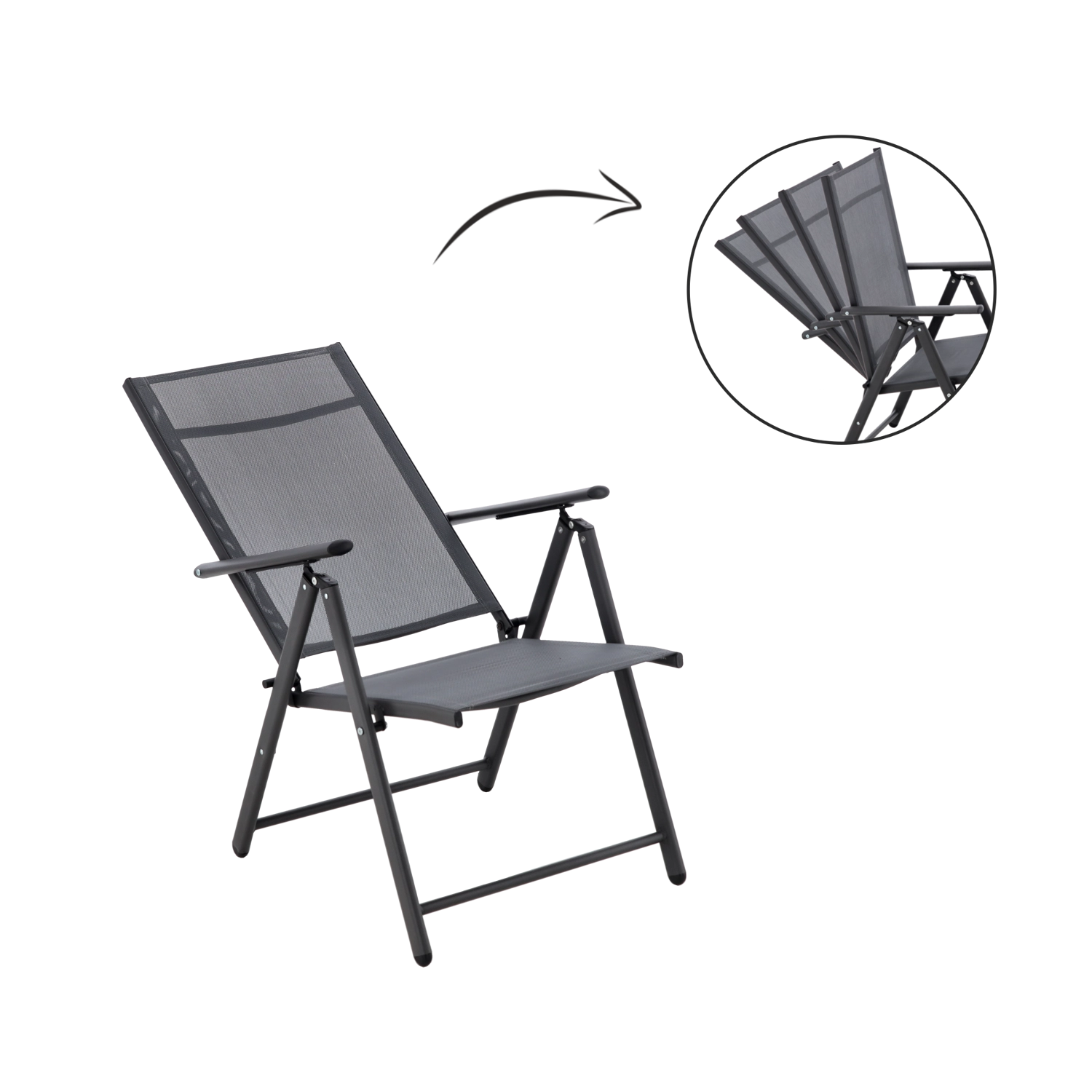 Élégante chaise de jardin grise en acier thermolaqué offrant une structure durable, un dossier réglable en 7 positions et une maille respirante pour un confort maximal sur la terrasse, le balcon ou au jardin. Son design pliable garantit un transport aisé et un rangement peu encombrant.