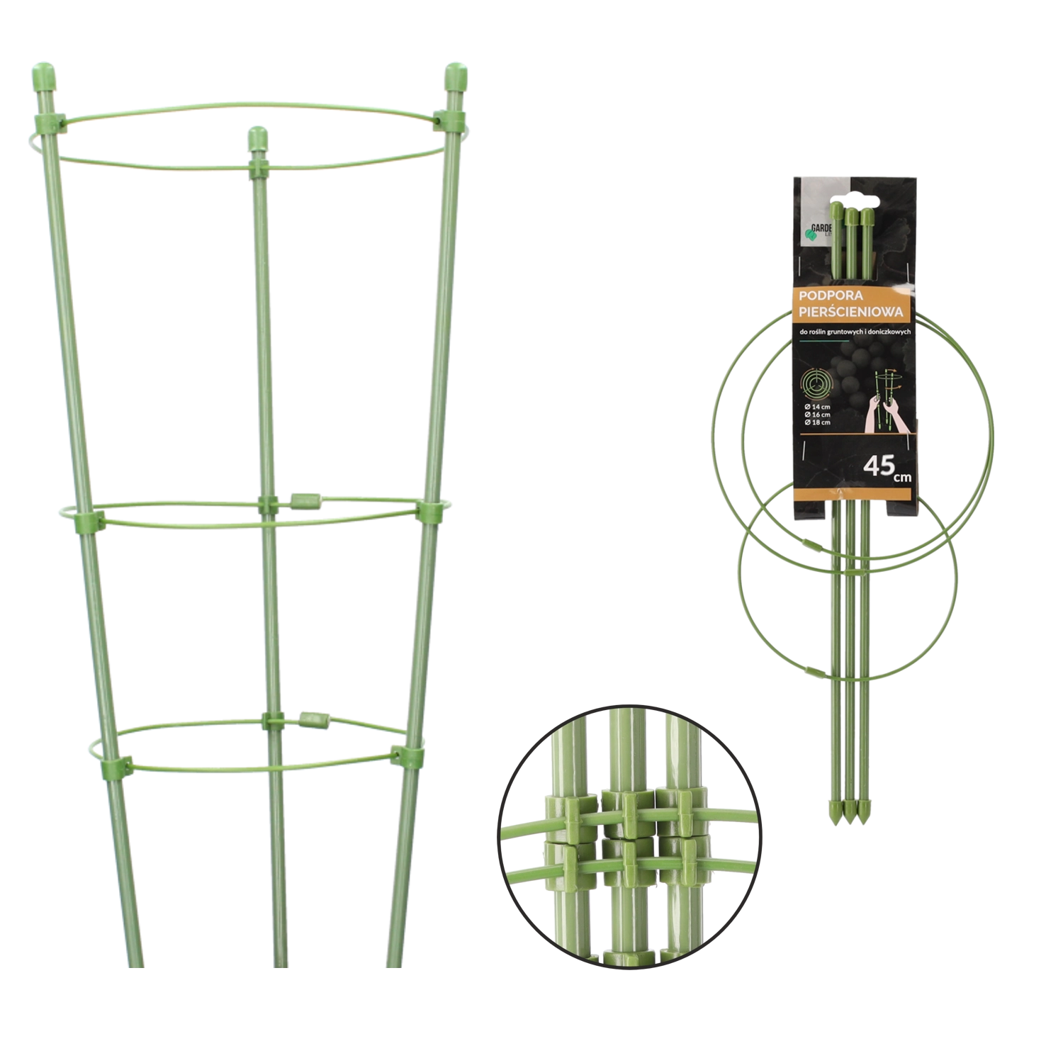Ce tuteur circulaire à trois anneaux est conçu pour guider en toute sécurité la croissance des plantes ornementales et potagères. L’acier robuste avec un revêtement en polyéthylène résiste à l’humidité, aux UV et aux dommages mécaniques, garantissant une longue durée d’utilisation toute la saison et au-delà. La finition verte assure une apparence discrète dans les massifs comme dans les pots.