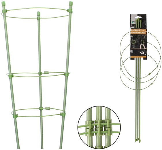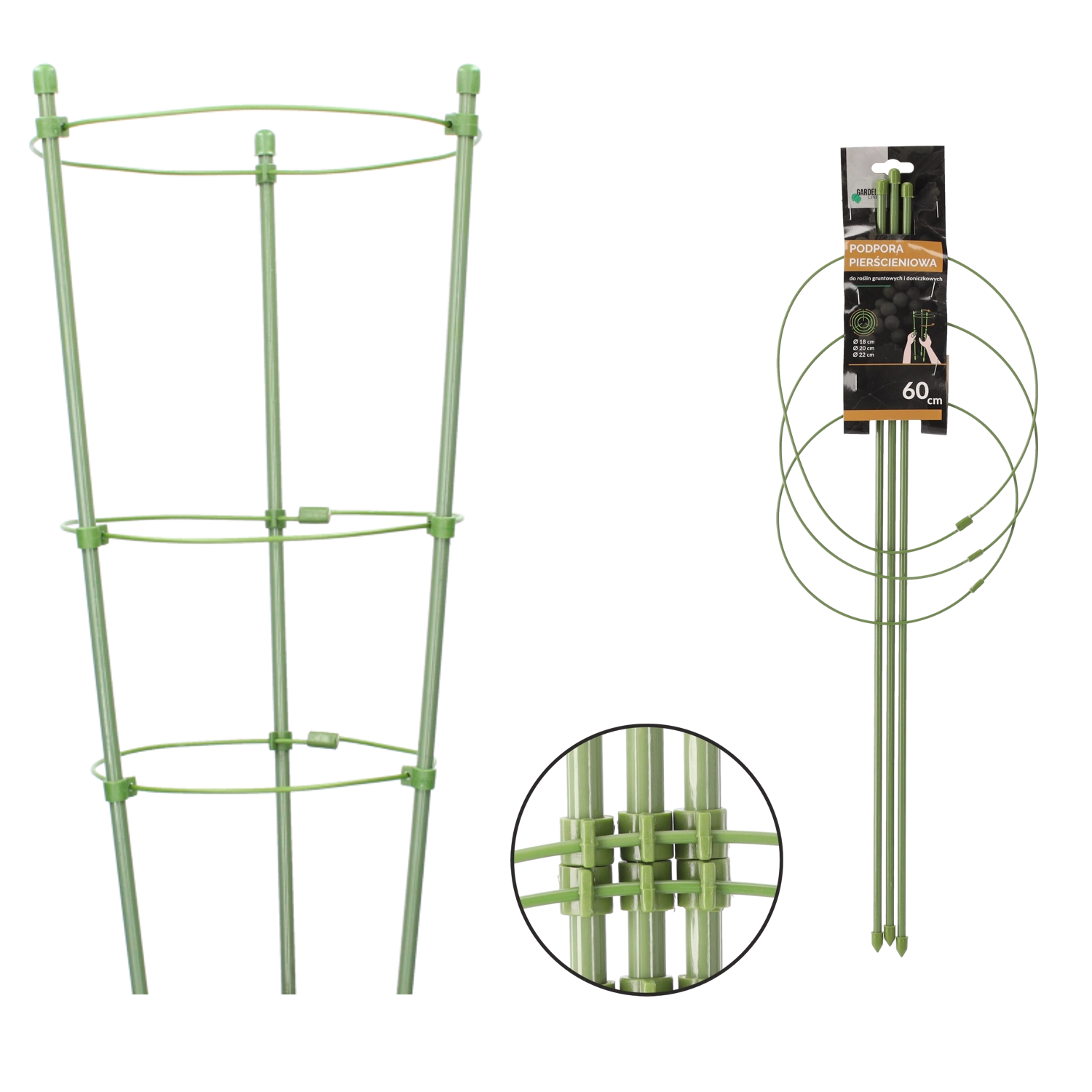 Tuteur circulaire pratique pour plantes d’une hauteur de 60 cm assurant une croissance stable sans casse des tiges. Grâce à l’acier résistant avec revêtement en polyéthylène et à sa discrète couleur verte, il se fond parfaitement dans la végétation. Trois anneaux de différents diamètres offrent une tenue fiable pour arbustes et fleurs, à la maison comme au jardin.