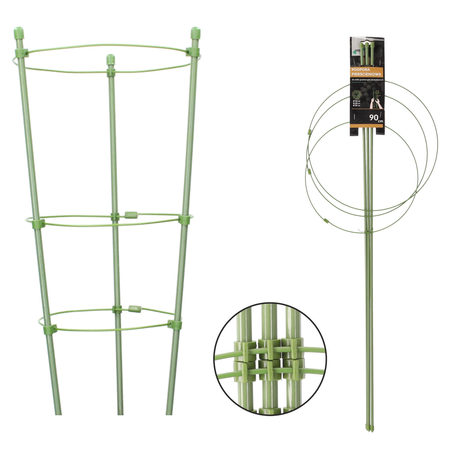 Tuteur circulaire pratique pour plantes d’une hauteur de 90 cm en acier résistant revêtu de polyéthylène, offrant une stabilisation fiable et une protection contre le vent. Grâce à sa couleur verte discrète, il se fond parfaitement dans la végétation et convient idéalement aux pots comme aux massifs – par exemple pour les myrtilles ou les hortensias.
