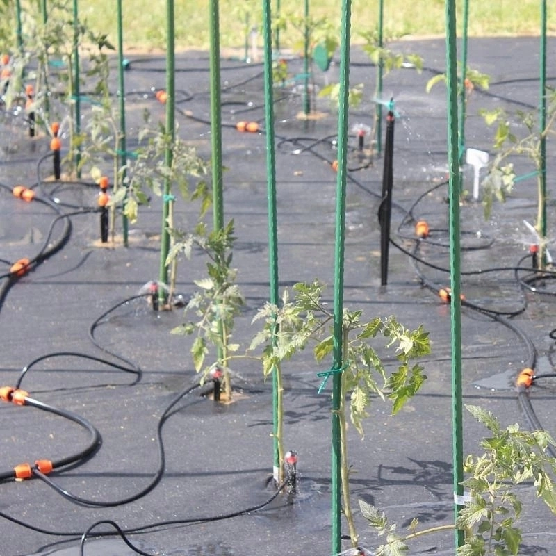 Le tuyau flexible, les raccords en T et les embouts permettent un montage rapide du système sur plate-bande comme sur toile anti‑mauvaises herbes. Les supports avec clou maintiennent les conduites exactement là où il faut.