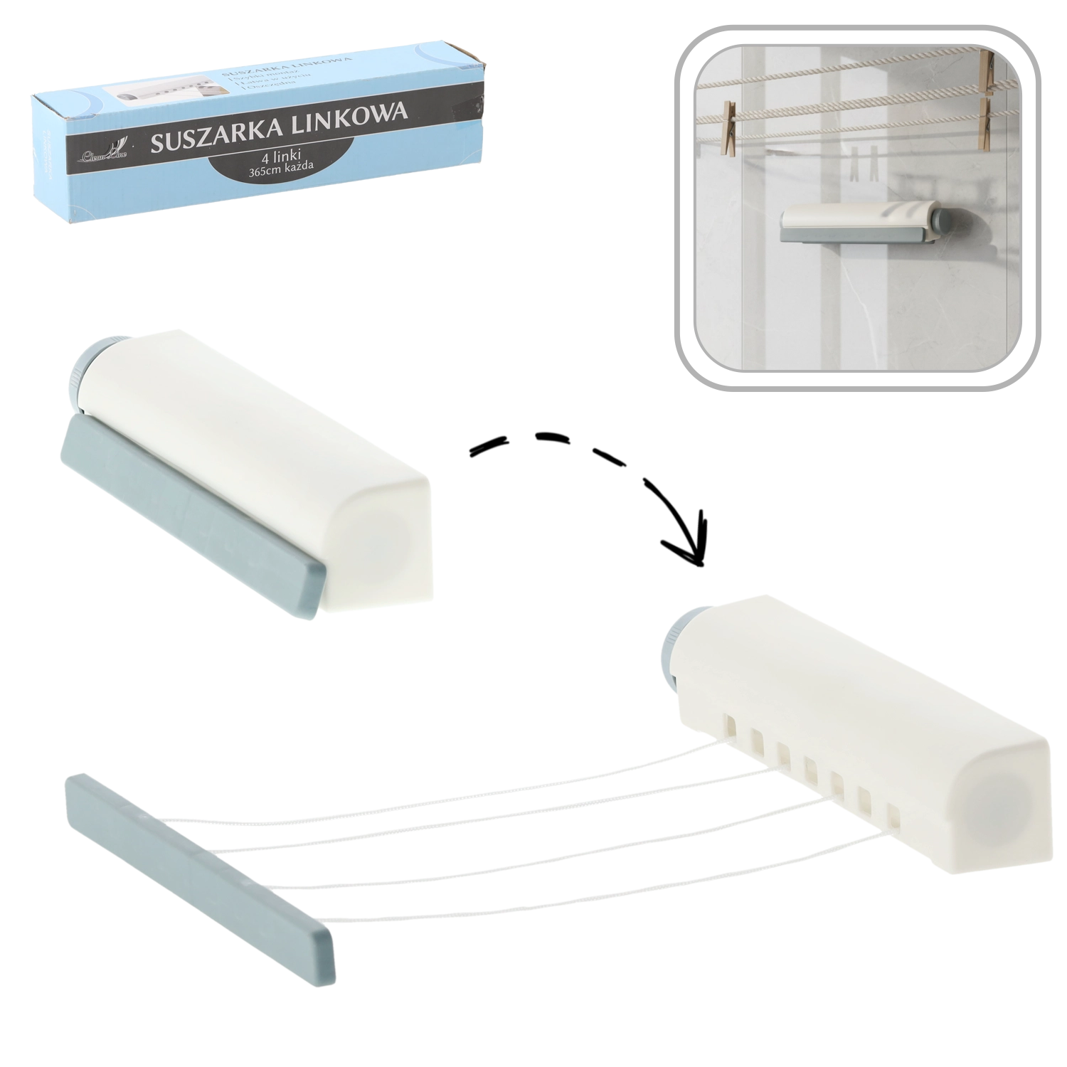 Sèche-linge à cordes compact avec enroulement automatique, idéal pour les petites salles de bains, le balcon et les voyages. Il offre 4 lignes réglables de 3,6 m chacune, soit plus de 14 m de surface de séchage. Installation facile entre deux murs opposés jusqu’à 360 cm et encombrement minimal une fois replié.