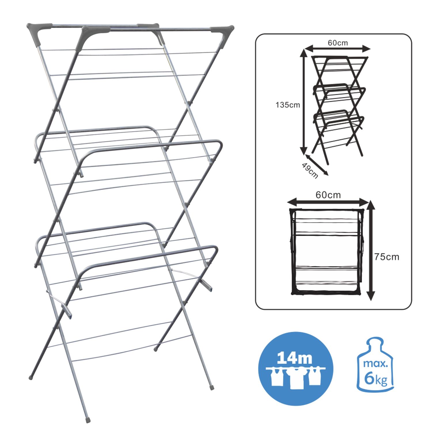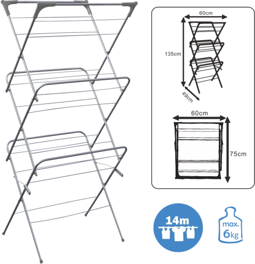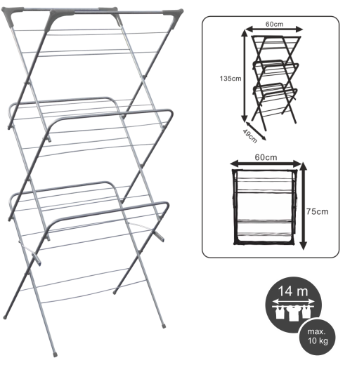 Le pratique sèche-linge CAMILLA à trois niveaux économise de la place et permet de sécher efficacement une grande quantité de vêtements et de textiles. Grâce à ses dimensions compactes, il convient au balcon, à la terrasse et aux petits appartements. Il offre une structure stable, une circulation d’air rapide pour réduire le temps de séchage et un pliage facile pour gagner de la place.