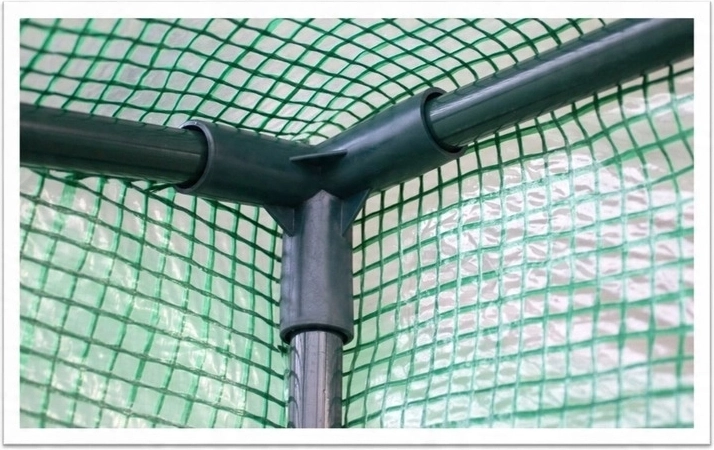 Tubes en acier Ø 16 mm avec connecteurs PE robustes formant une structure rigide. Ourlet inférieur à enterrer et piquets métalliques pour plus de stabilité même en cas de vent.