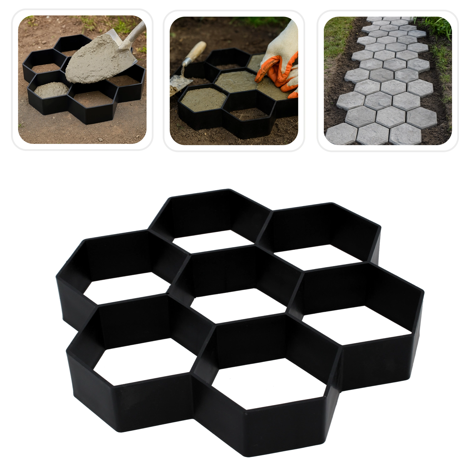 Le moule est conçu pour un coulage du béton rapide et propre. Il suffit de le poser sur le support, de remplir avec le mélange, de lisser, puis, après la prise initiale, de le soulever – la forme se répète facilement et se compose en divers motifs. Grâce à ses dimensions universelles 29 × 29 × 4 cm, vous concevez aisément un chemin adapté à l’espace et au style de votre jardin.