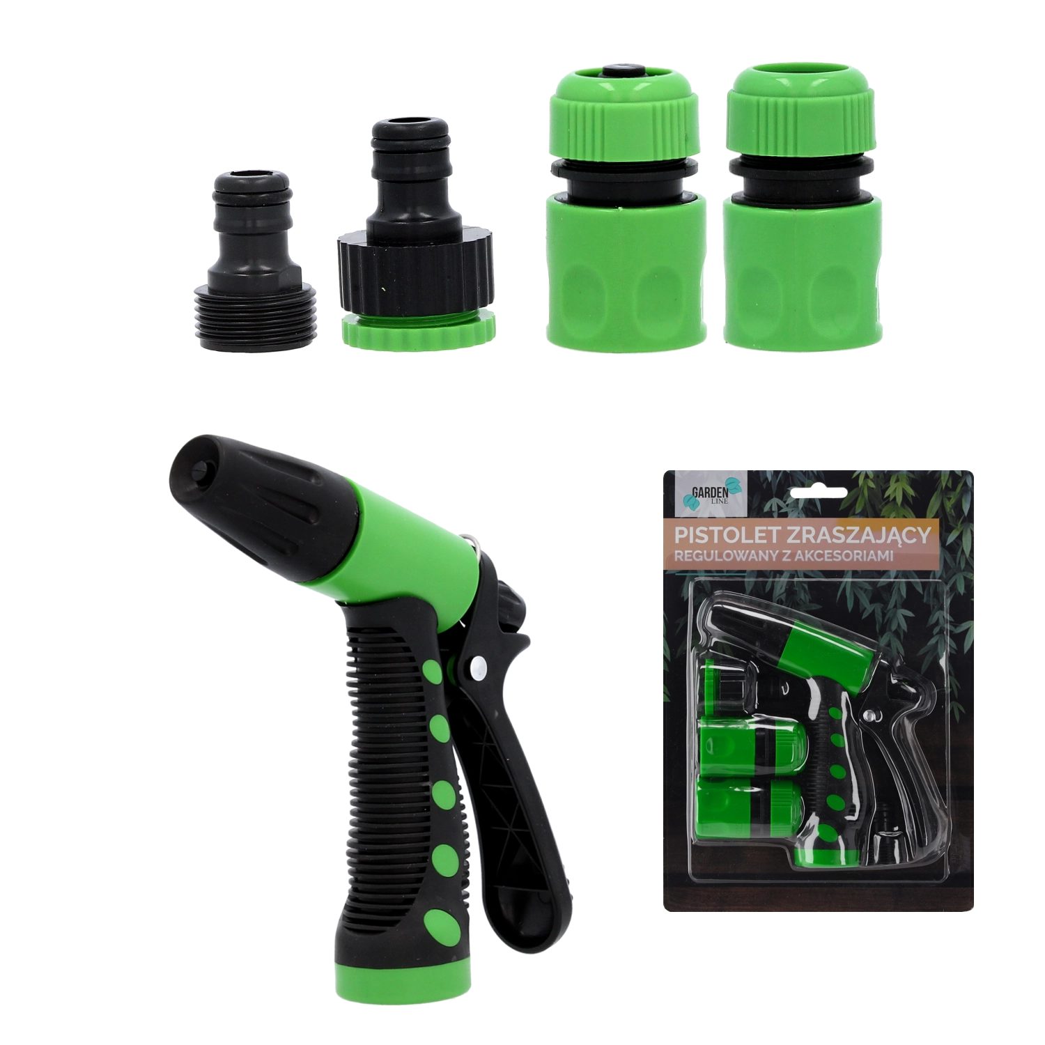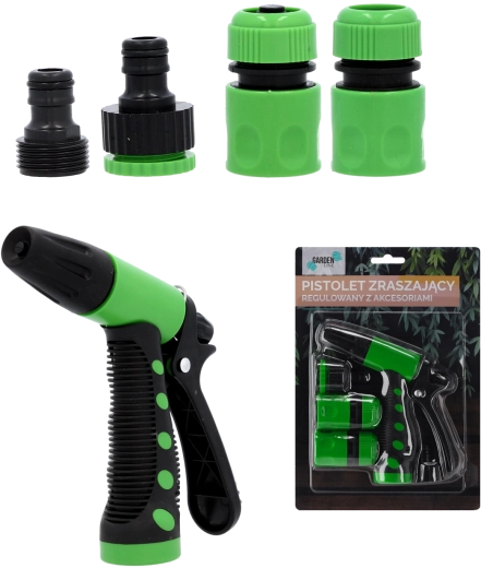 - Pistolet pulvérisateur réglable ; raccord rapide 1/2" avec arrêt ; raccord rapide 1/2" sans arrêt ; adaptateur de robinet 1/2"–3/4"