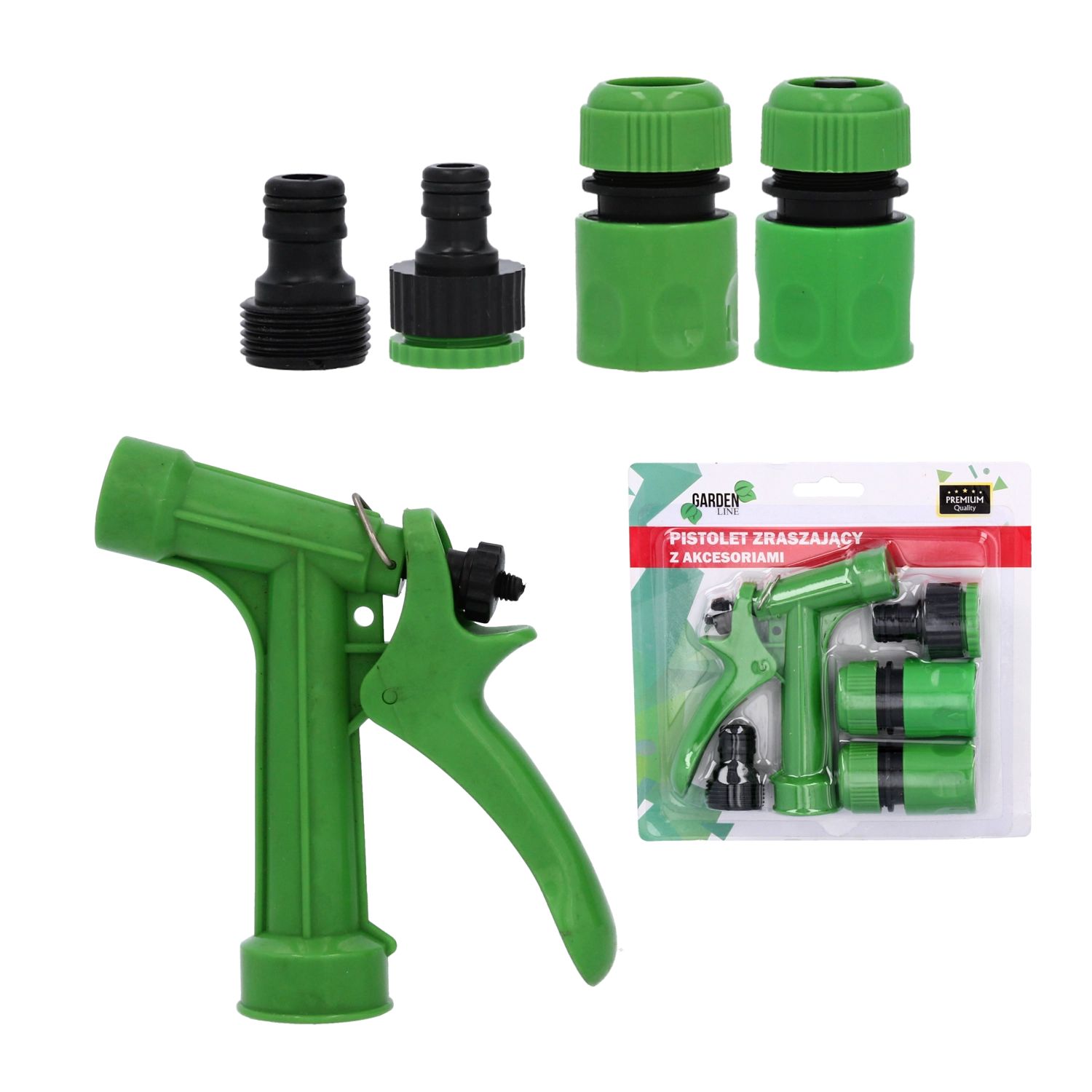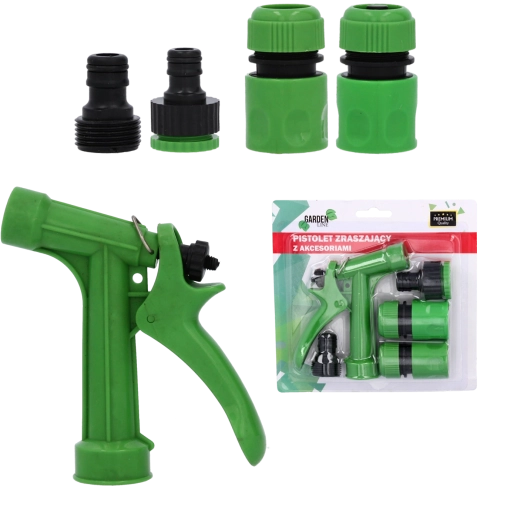 Pistolet d’arrosage universel avec accessoires complets pour un arrosage confortable du jardin. Poignée ergonomique avec revêtement souple antidérapant pour une prise en main sûre, construction en plastique résistante pour une longue durée de vie et raccords rapides 1/2" compatibles ainsi qu’un adaptateur 3/4" pour un branchement rapide à la plupart des tuyaux et robinets.