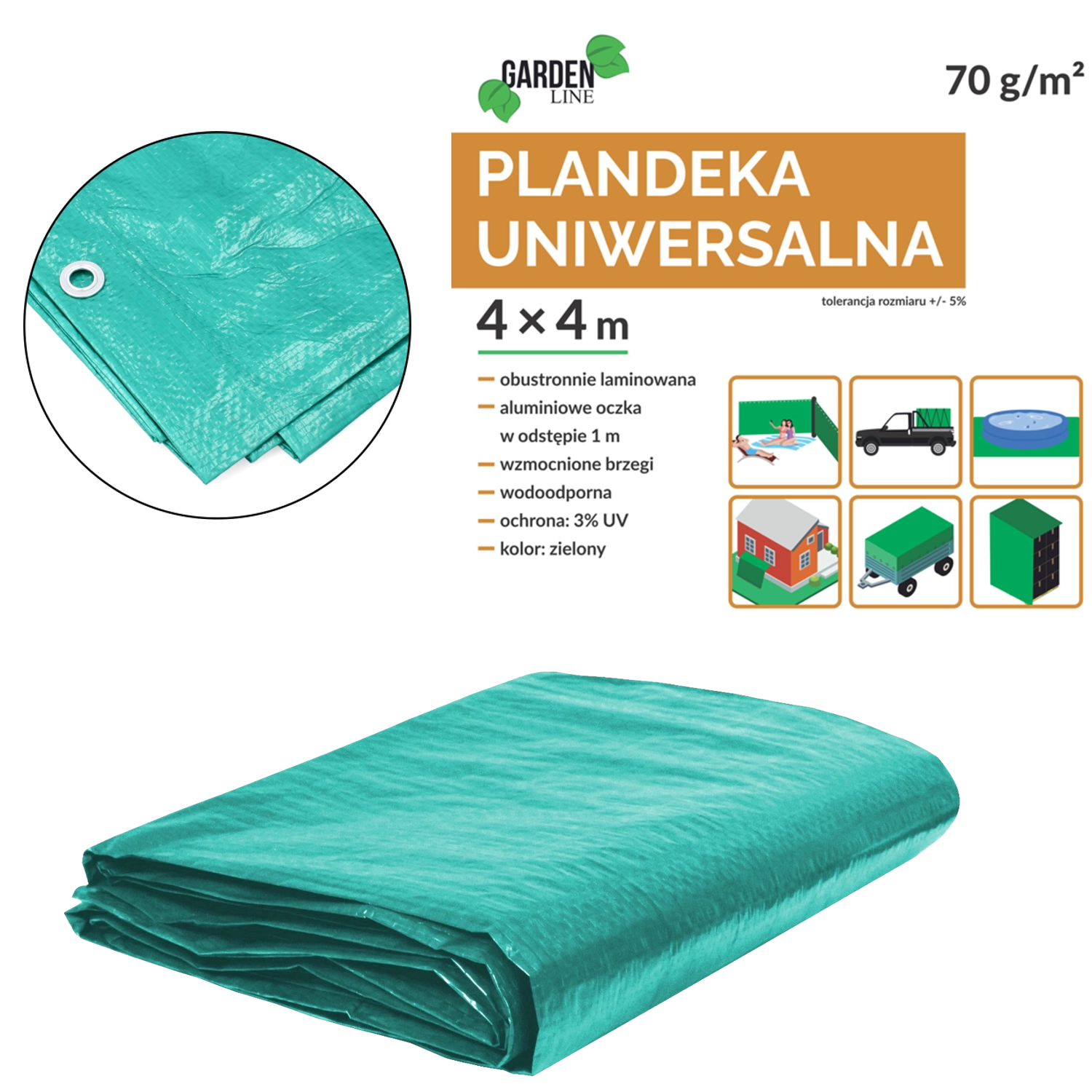 Bâche de couverture universelle en PE de qualité, grammage 70 g/m², protège de la pluie, de la poussière et du soleil. Laminée des deux côtés, avec bords renforcés par une corde et œillets en aluminium tous les 1 m. Coloris vert, protection UV 3 %, dimensions 4 × 4 m (+/−5 %).