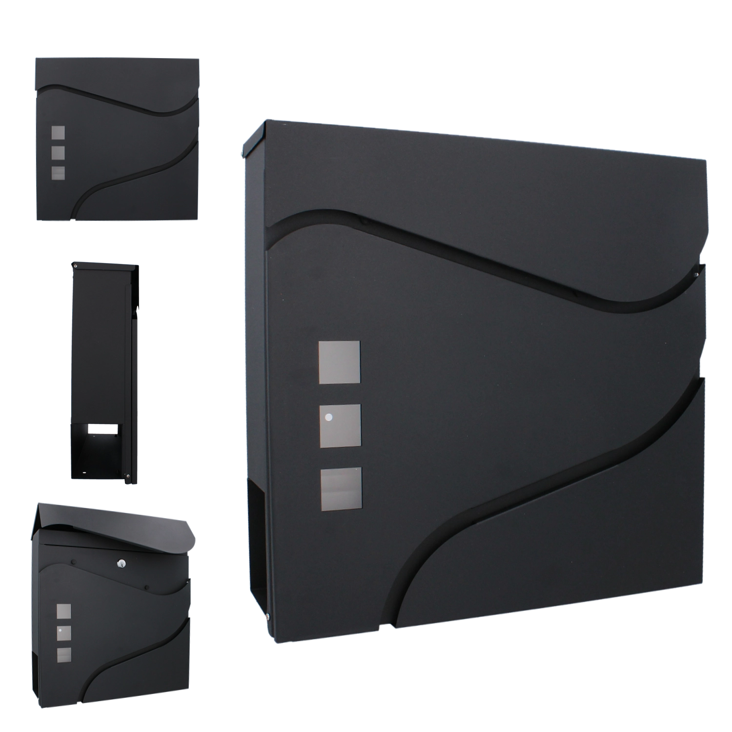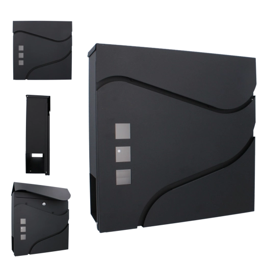 La boîte aux lettres élégante Stork en noir mat associe acier galvanisé résistant et revêtement par poudre pour une longue durabilité en extérieur. Elle offre un couvercle supérieur pour l’insertion, une porte frontale verrouillable pour un retrait sécurisé du courrier et des fenêtres de visualisation pour un contrôle rapide du contenu. Ses dimensions compactes 37 × 37 × 10,5 cm conviennent à une maison, un portail ou un immeuble.