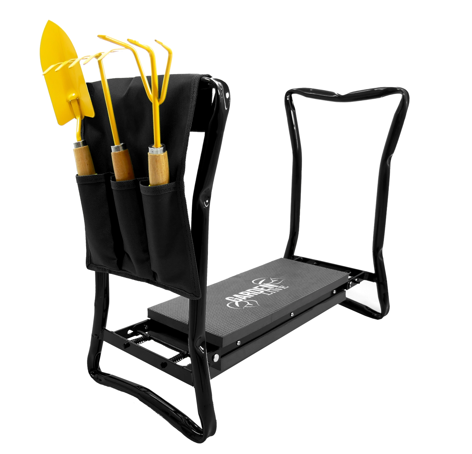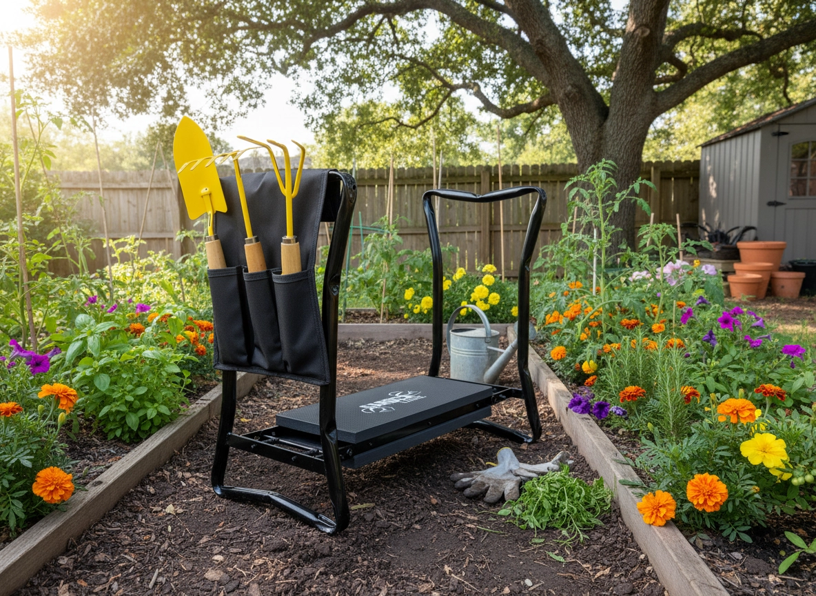 Assistant de jardin universel 3 en 1 : genouillère, siège et organiseur latéral pour outils. Cadre métallique robuste avec poignées intégrées pour faciliter le relevage, coussin EVA souple protégeant les genoux et améliorant le confort. Structure qui se plie à plat rapidement pour un transport aisé et un rangement compact. Charge maximale 150 kg.