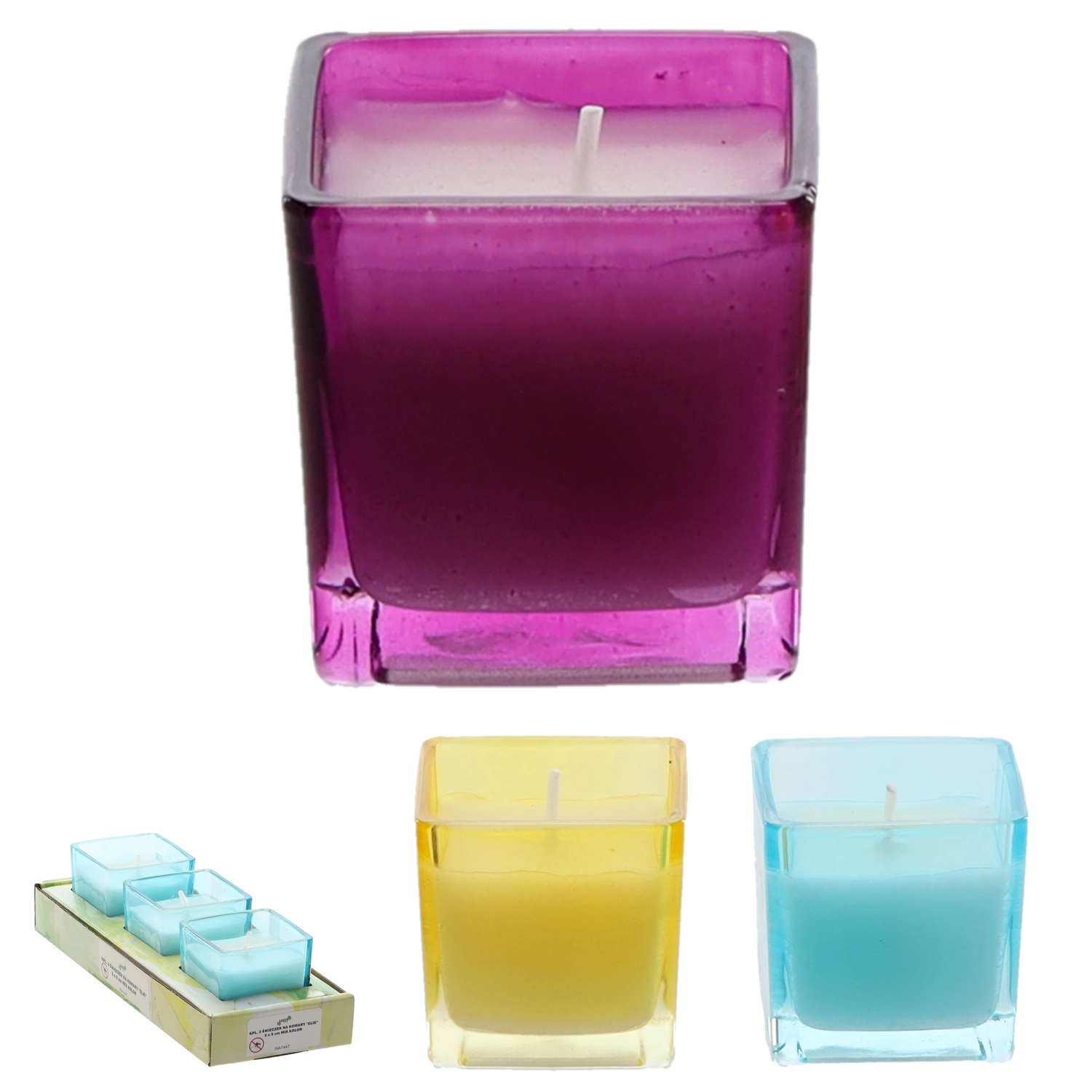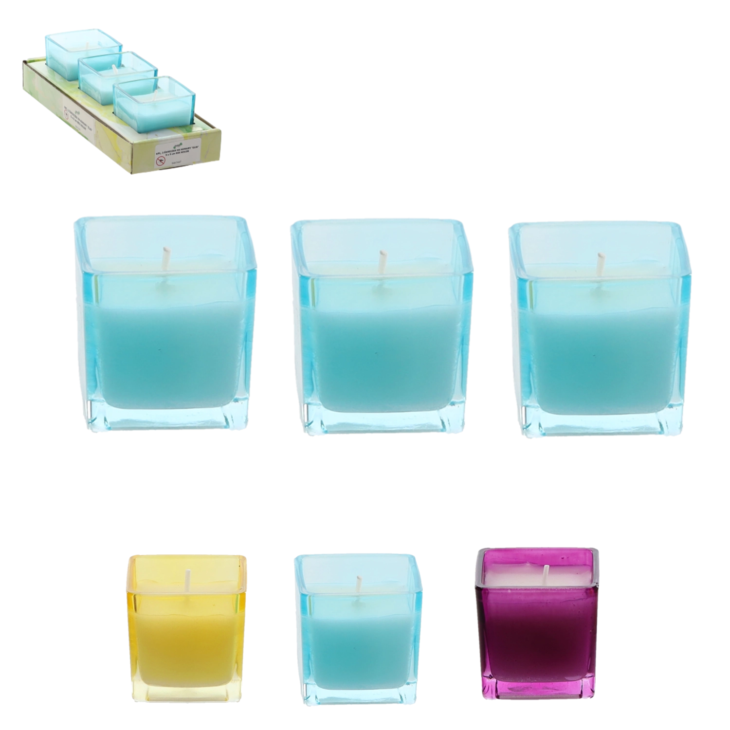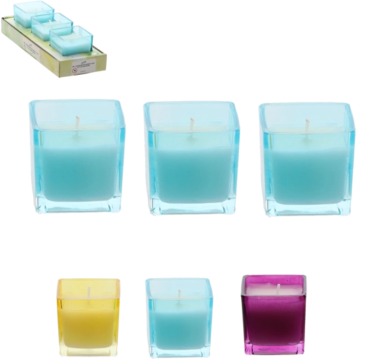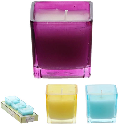 Élégant set de trois bougies dans des photophores en verre aux couleurs violet, bleu et jaune. La cire contient de l'huile essentielle de citronnelle, réputée pour ses effets répulsifs contre les moustiques. Le format compact 5 x 5 cm convient aux terrasses, balcons et intérieurs.