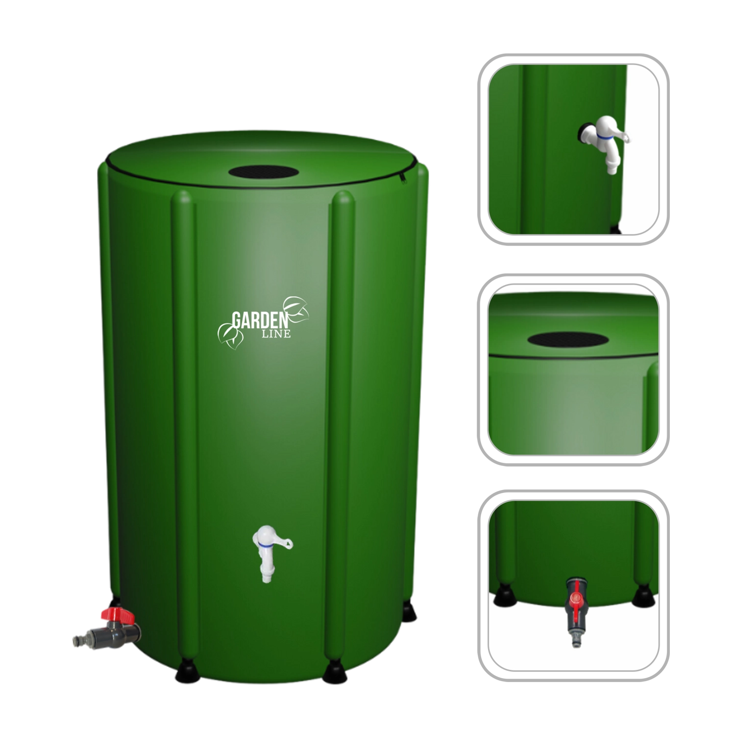 L’emballage comprend tout le nécessaire pour une installation rapide et une utilisation confortable : robinet de puisage, vanne de trop-plein, filtres maillés anti-impuretés et tuyau flexible. Le grand volume de 500 l couvre l’arrosage régulier des massifs, de la serre et le nettoyage de l’outillage de jardin.