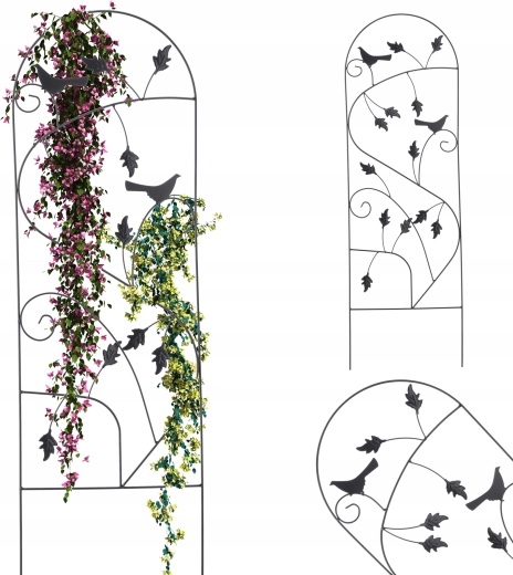 Ce support de jardin élégant, doté d’une partie supérieure arquée et de motifs décoratifs de feuilles et d’oiseaux, est conçu pour guider les plantes grimpantes vers le haut. Grâce à sa structure métallique solide, il offre un soutien fiable et aide à garder la végétation ordonnée tout en la protégeant du vent.