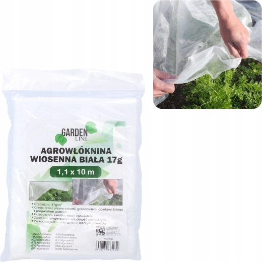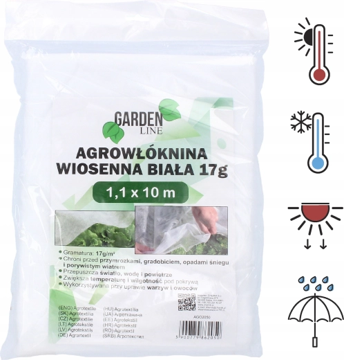 Le matériau à faible grammage de 17 g/m² est léger et délicat pour les plantes – il ne les casse pas et ne les déforme pas. La stabilisation UV prolonge la durée de vie et la résistance au rayonnement solaire. L’agrotextile se fixe facilement avec des piquets, des pierres ou de la terre, et peut être soulevé à tout moment pour l’arrosage ou la récolte.