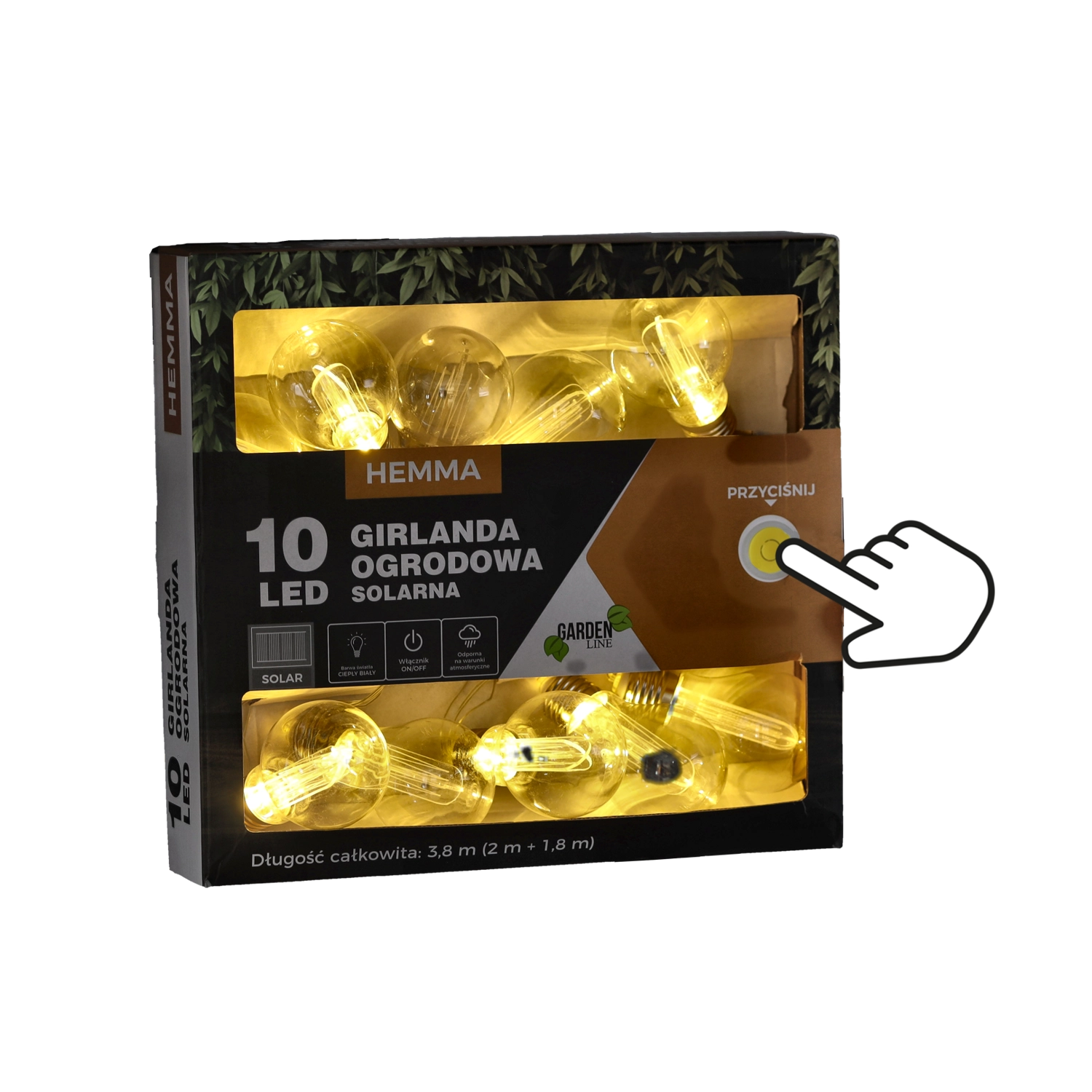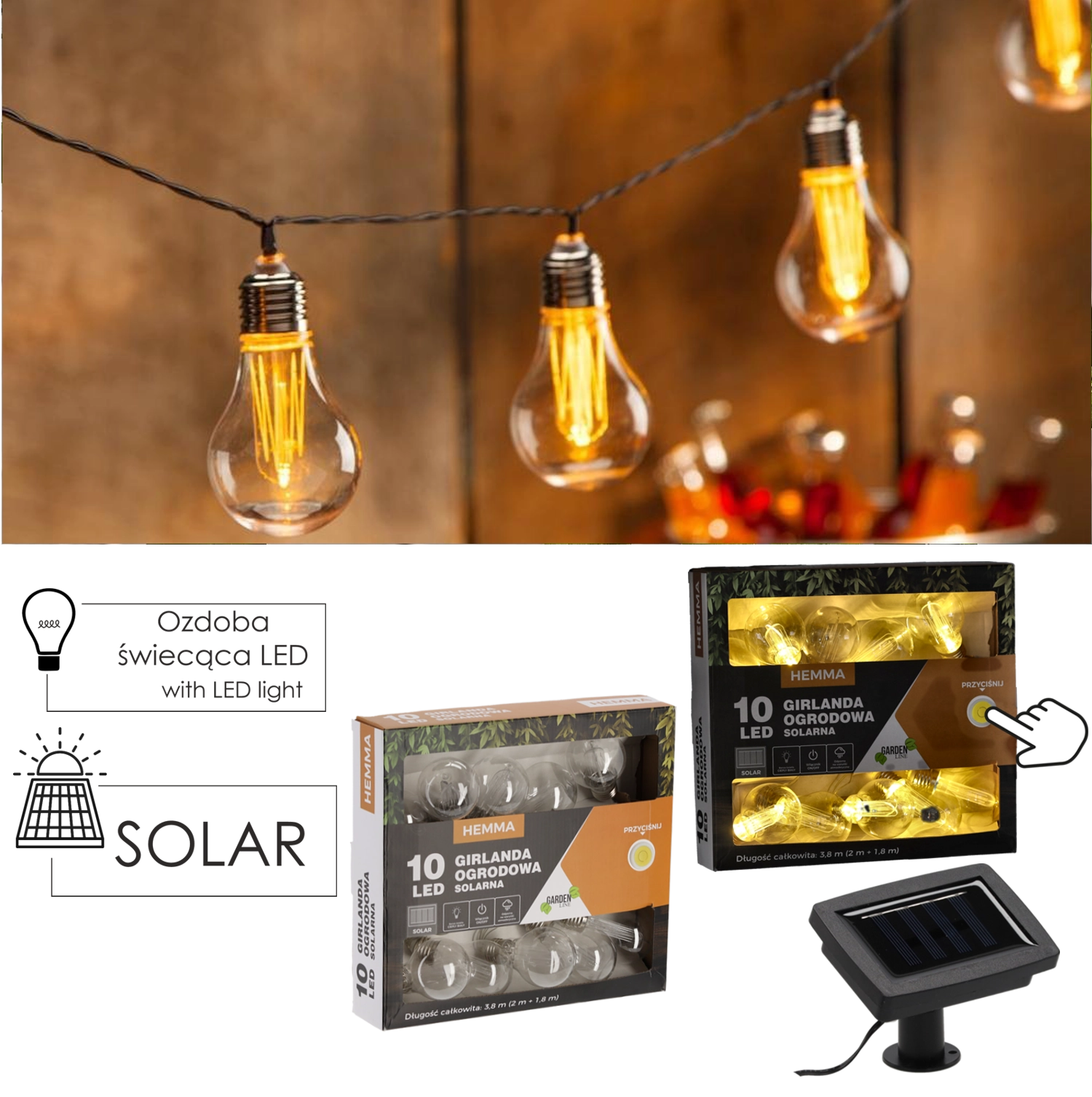 Guirlande solaire de jardin 3,8 m, 10 LED blanc chaud, grosses ampoules