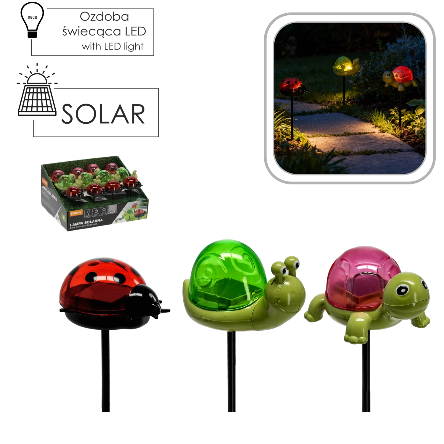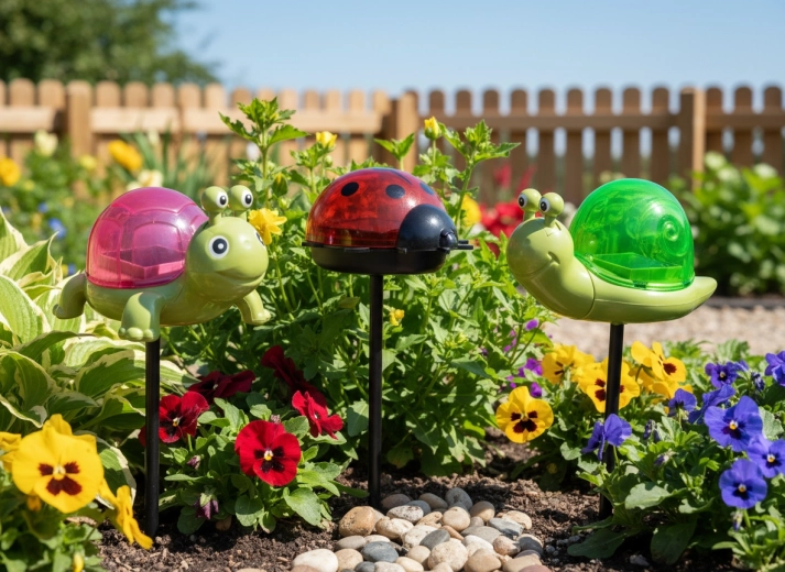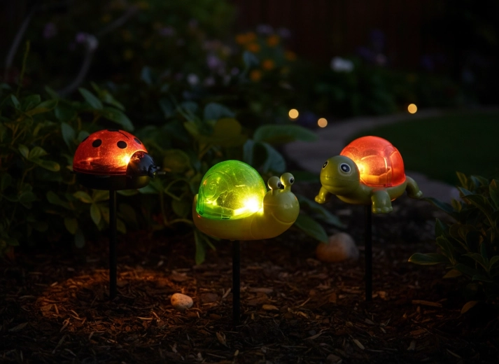 La tortue, l’escargot et la coccinelle, avec leurs « carapaces »/coquilles semi‑translucides et colorées, ajoutent une touche joyeuse à toute plantation et l’illuminent délicatement le soir d’une lumière chaleureuse.