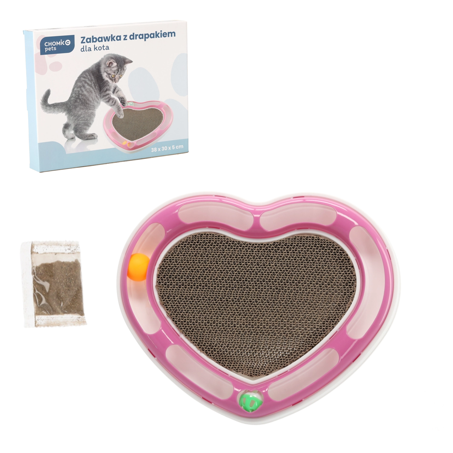 Ce jouet design en forme de cœur réunit deux activités félines favorites : poursuivre des balles sur une piste et griffer sur un carton ondulé. Les balles dissimulées dans la piste circulaire invitent le chat à les pourchasser et à les pousser délicatement avec les pattes, tandis que le centre en carton ondulé offre l’endroit idéal pour l’entretien des griffes.