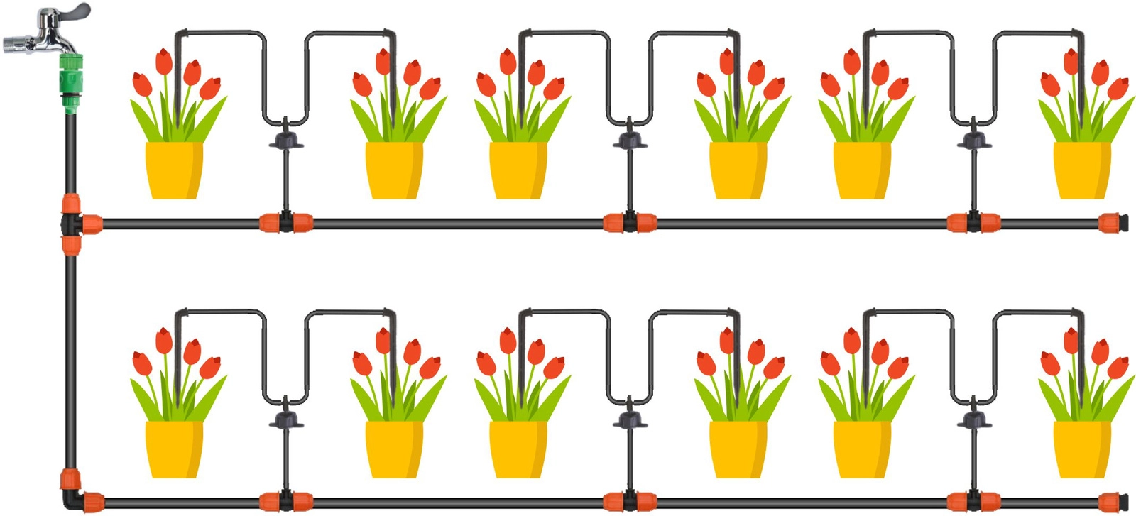 Ce kit complet d’irrigation goutte à goutte est un excellent choix pour les jardins, bacs surélevés, jardinières de balcon et pots suspendus. Il offre un dosage d’eau précis et ciblé directement au niveau des racines, favorisant une croissance saine tout en économisant l’eau et le temps. Grâce aux composants de dérivation, vous pouvez adapter le système à la disposition de vos plantes.