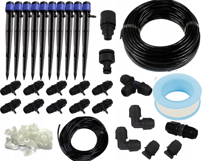 L’installation est simple : raccordez l’adaptateur de robinet, déployez la conduite principale 9×12 mm, dérivez avec des tés réducteurs vers 4×7 mm et terminez par des goutteurs sur piquets. Le ruban PTFE assure l’étanchéité des filetages, les clips maintiennent un réseau ordonné. Grâce au système modulaire, le kit se développe et s’adapte facilement.