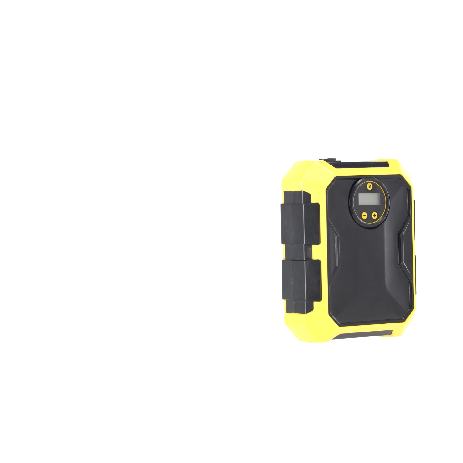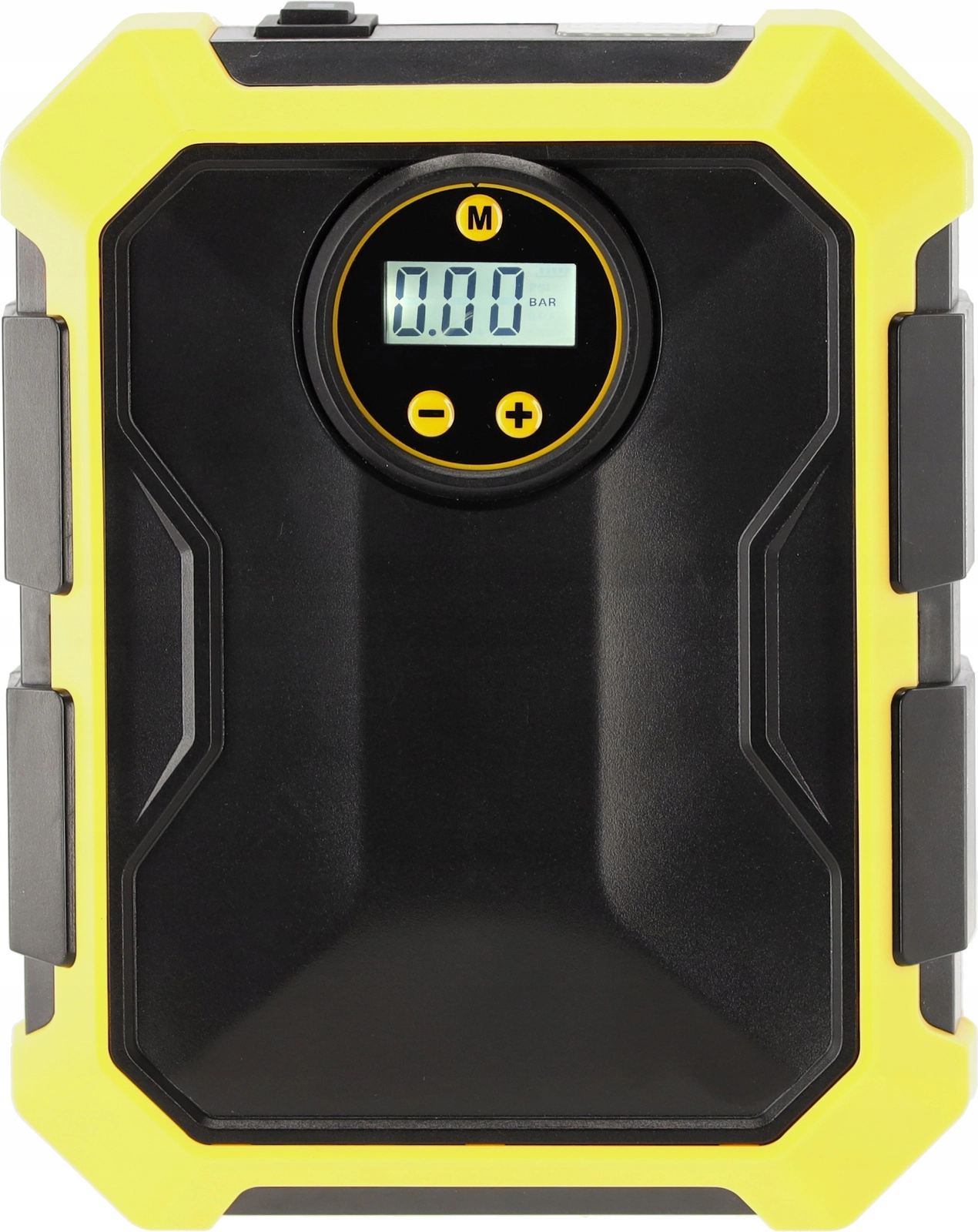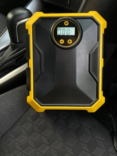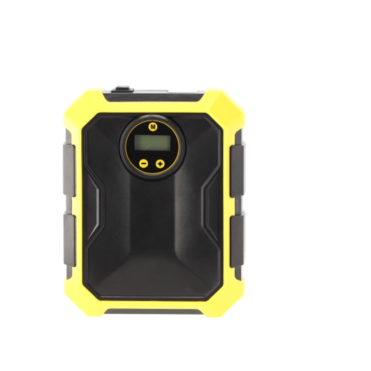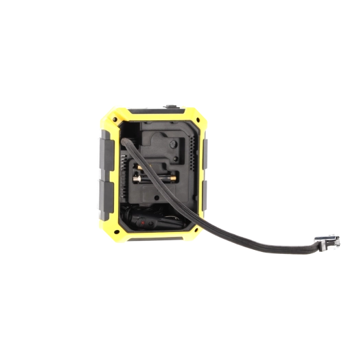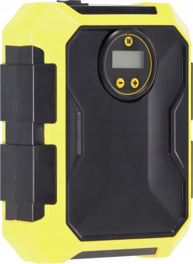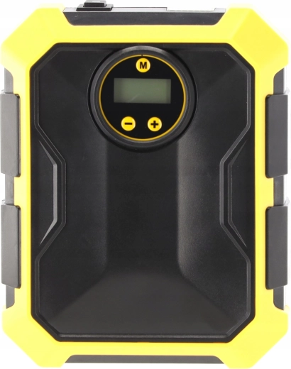 Compresseur automobile compact 12 V / 100 W avec écran numérique, arrêt automatique à la pression préréglée et éclairage LED. Alimentation pratique via prise 12 V, sélection de 4 unités de pression (PSI, kPa, bar, kg/cm²) et compartiments intégrés pour le tuyau, le câble et les accessoires – l’équipement idéal pour tout véhicule.