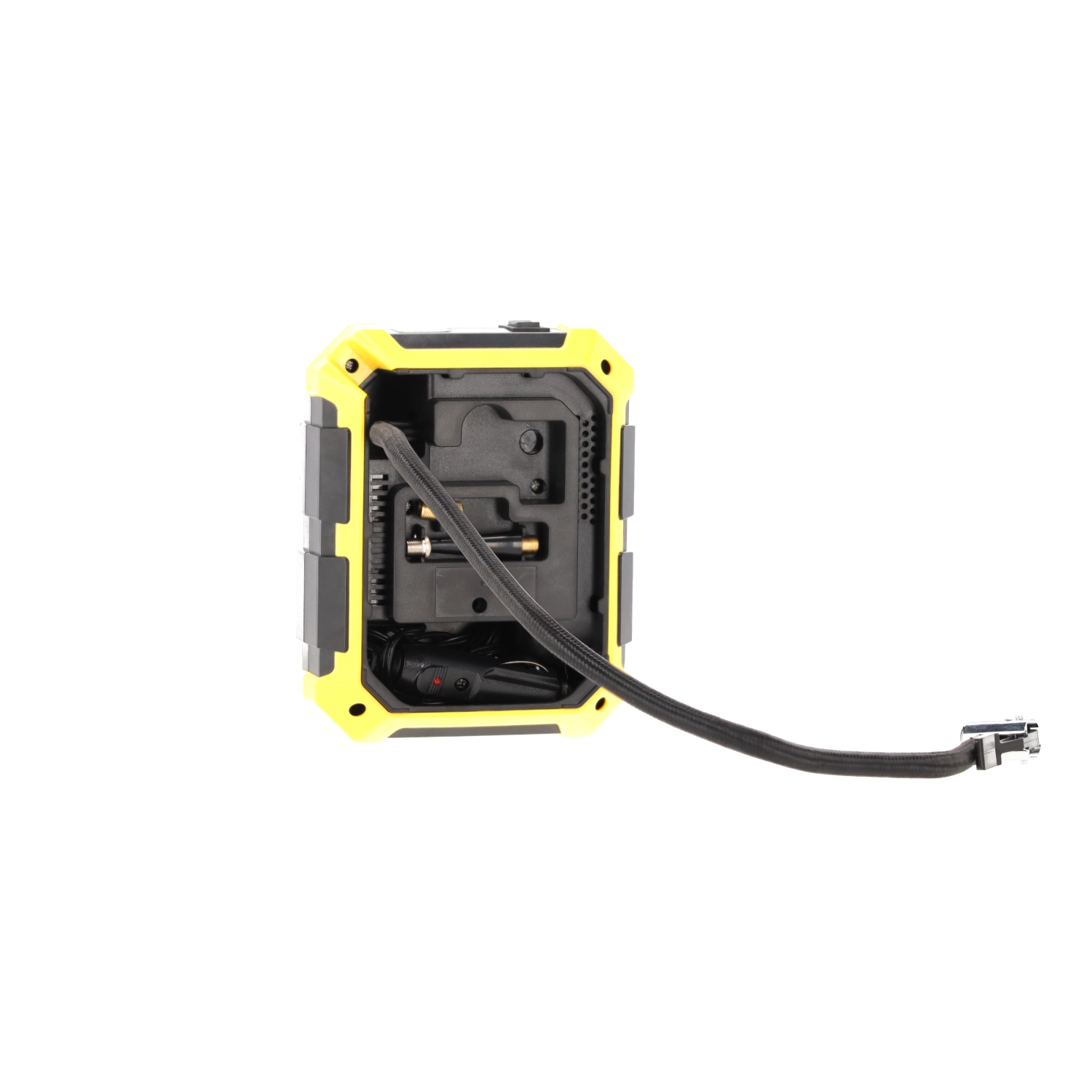 Tous les éléments nécessaires sont stockés directement dans le boîtier – tuyau, câble 12 V et embouts. Après usage, refermez simplement les compartiments et tout est rangé.