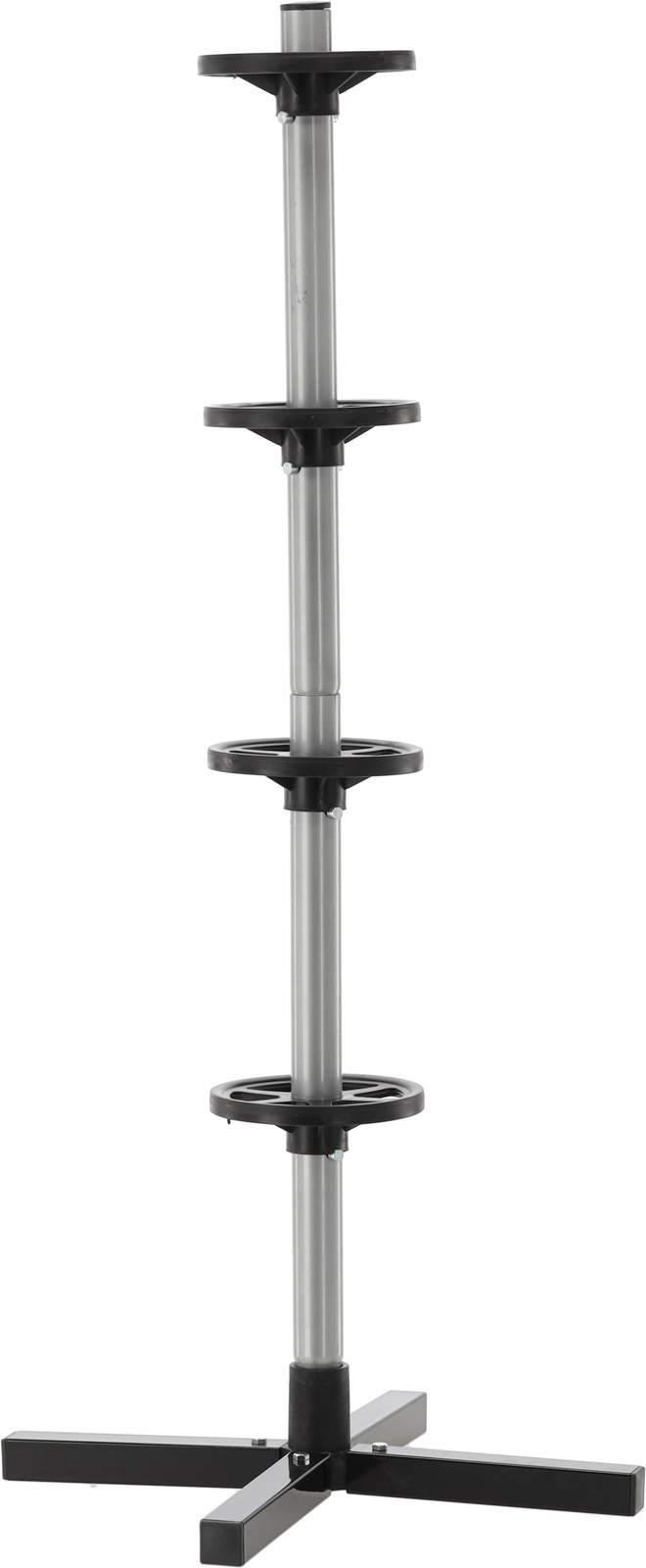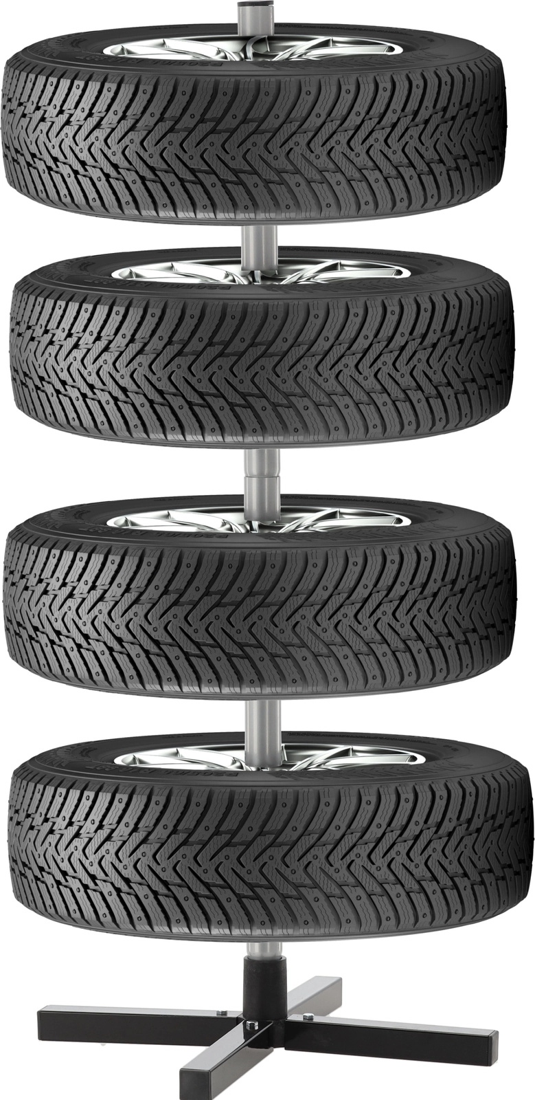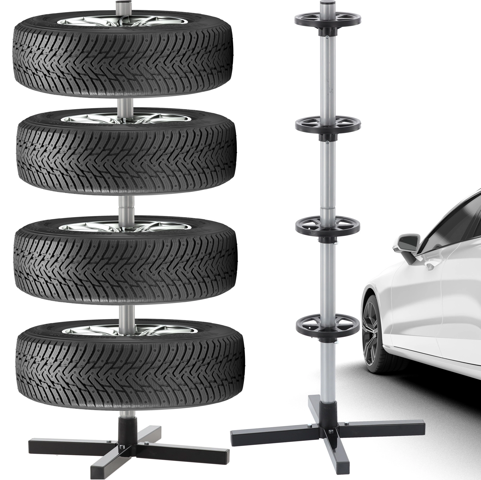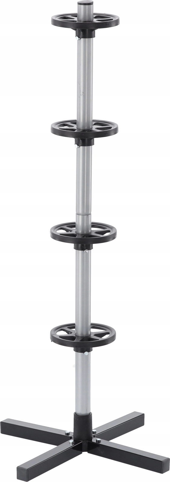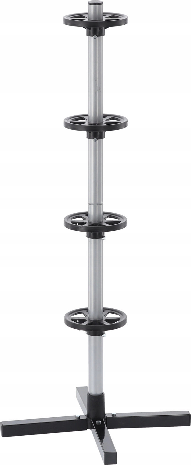 Rangez votre jeu saisonnier de pneus de manière claire et sécurisée. Le support vertical avec base en croix maintient jusqu’à quatre roues hors du sol, économisant de la place et évitant les plats sur la bande de roulement. L’acier résistant, les bagues d’espacement et la base solide assurent la stabilité même à pleine charge.