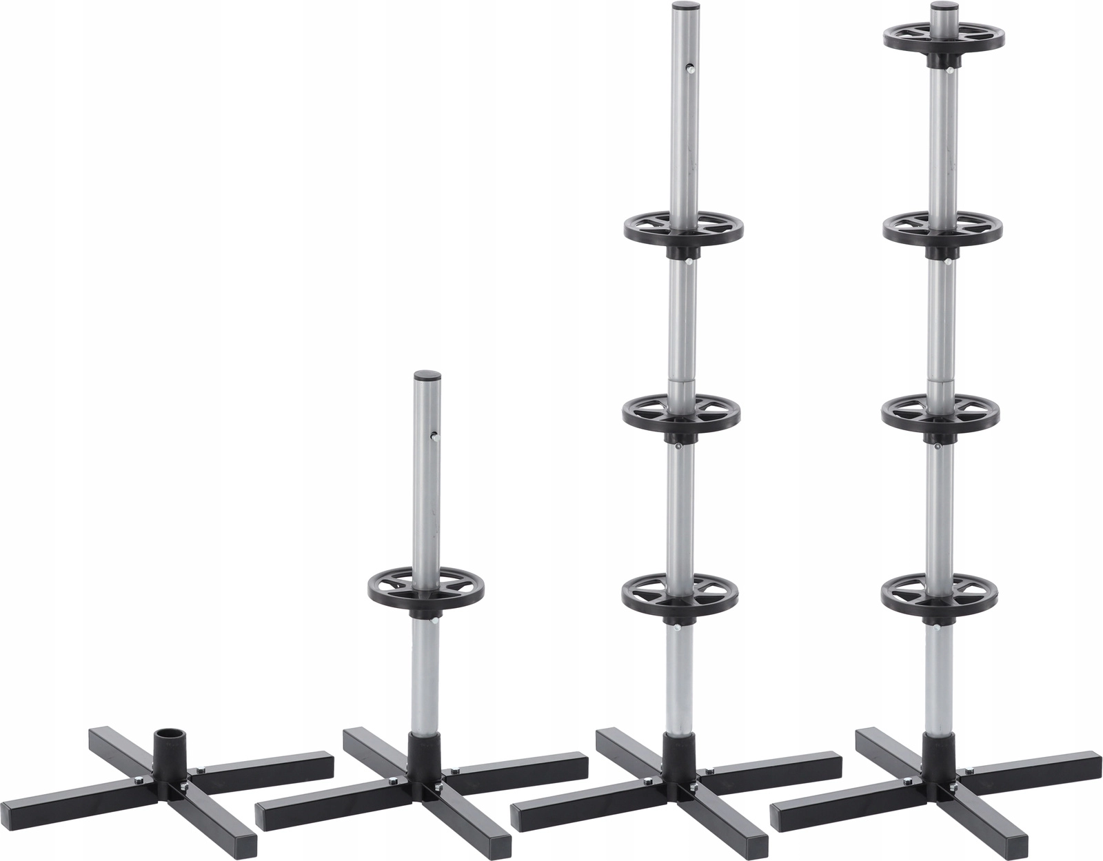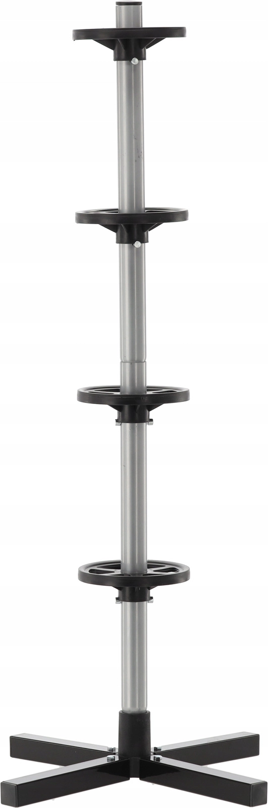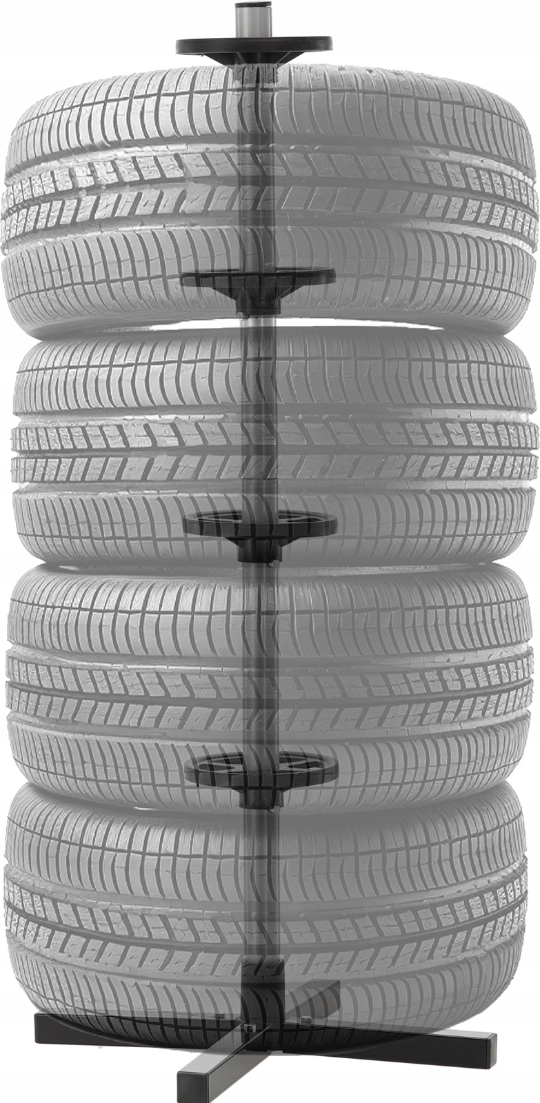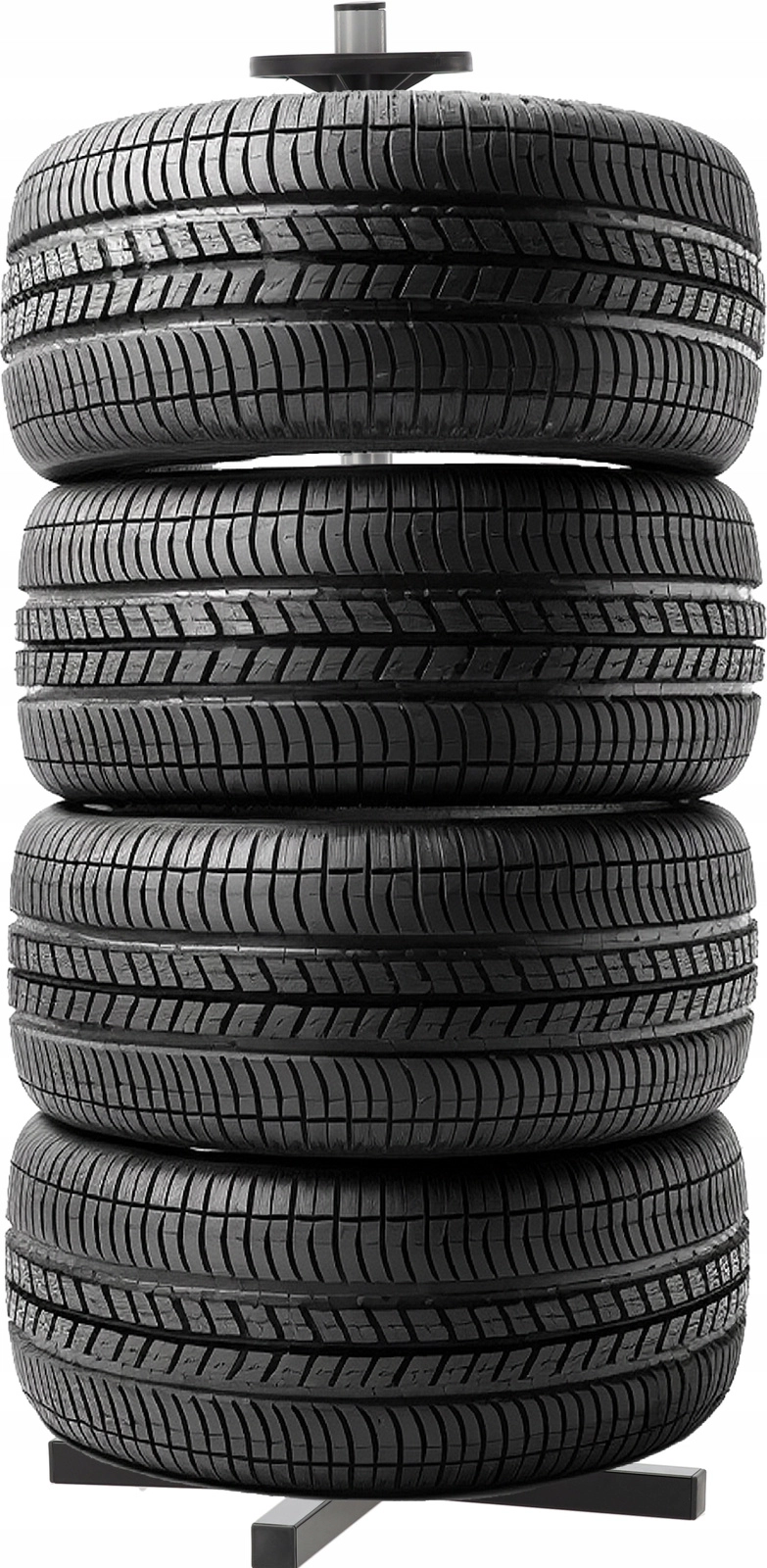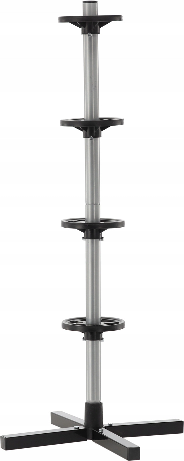 Rangez votre jeu saisonnier de pneus de manière claire et sécurisée. Le support vertical avec base en croix maintient jusqu’à quatre roues hors du sol, économisant de la place et évitant les plats sur la bande de roulement. L’acier résistant, les bagues d’espacement et la base solide assurent la stabilité même à pleine charge.