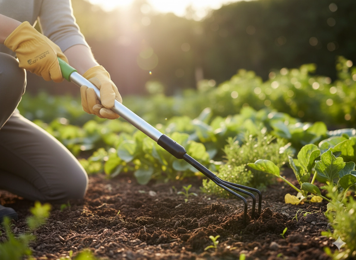 Les pointes robustes fragmentent efficacement même le sol compacté et aident à retirer les mauvaises herbes entre les plantes.