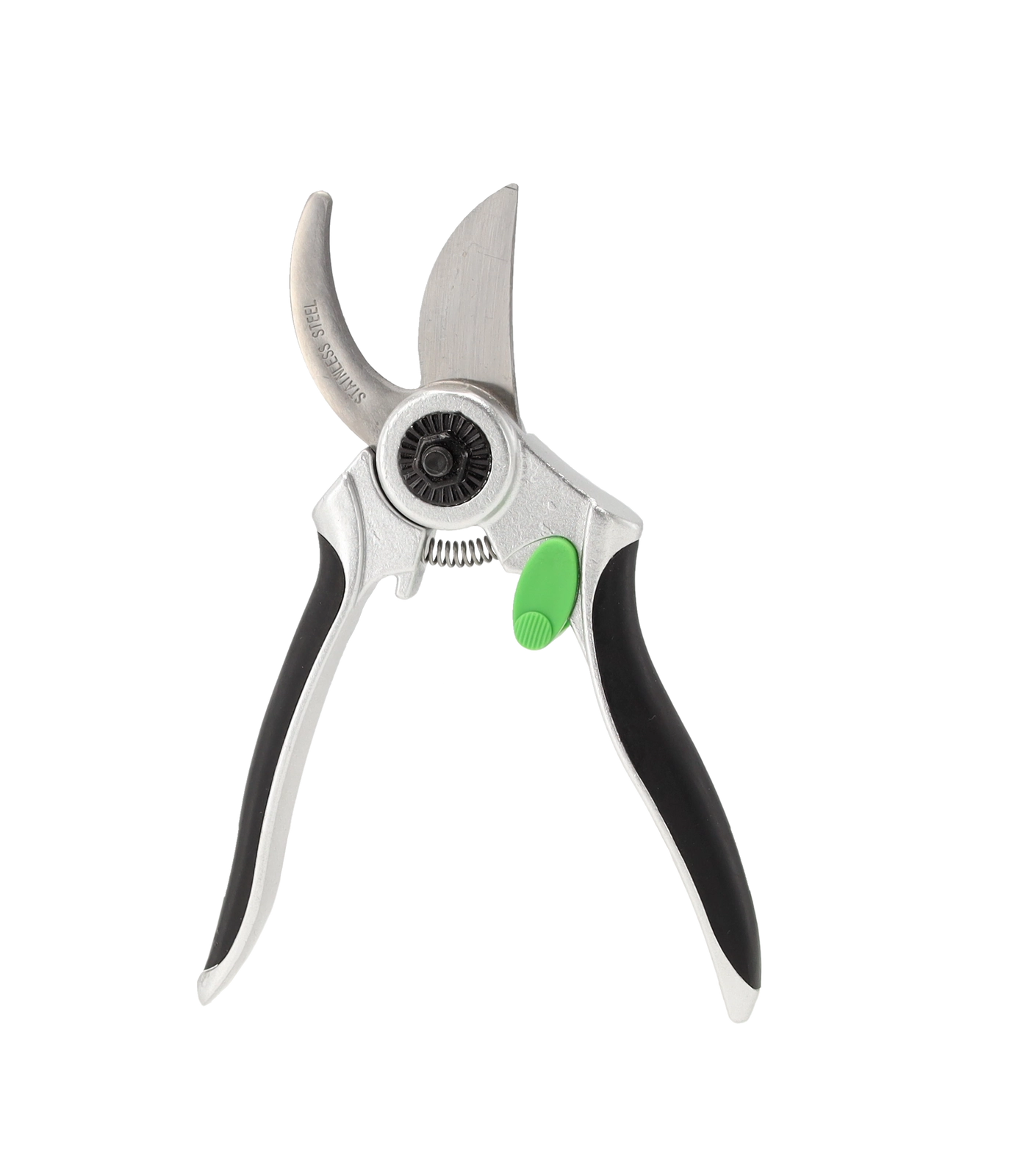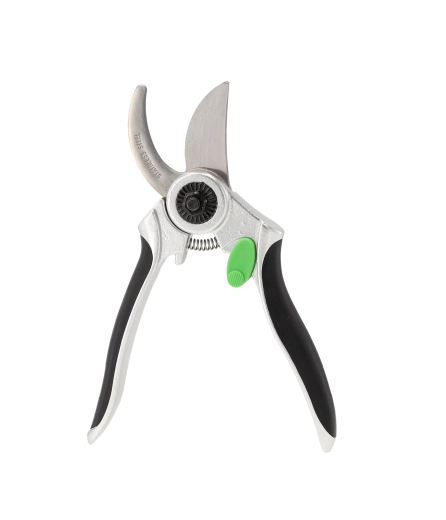 Sécateur bypass ergonomique avec verrou de sécurité, idéal pour des coupes précises de tiges et de petites branches. Poignées texturées pour une prise en main sûre.