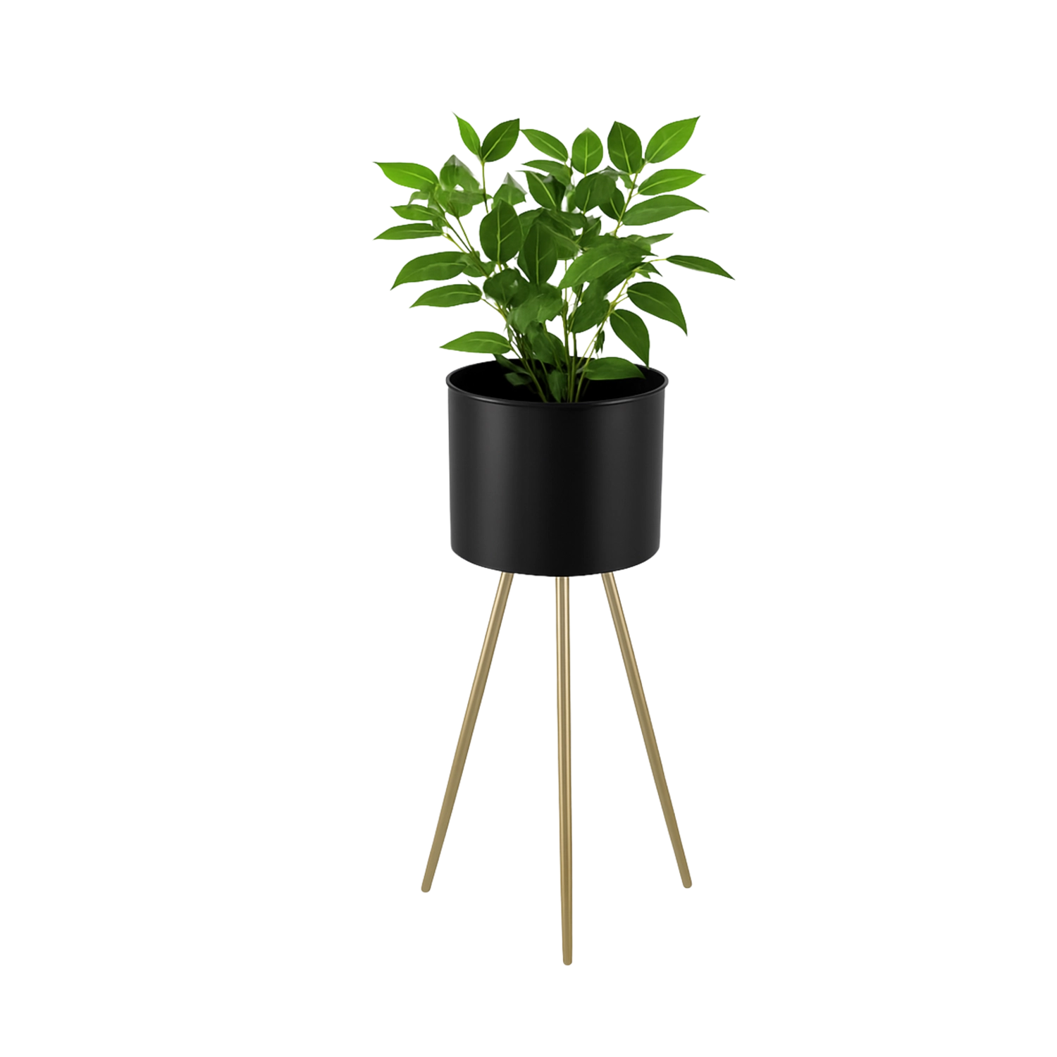 Support à plantes stylé de 18 × 18 × 50 cm en noir avec pieds dorés, idéal pour les intérieurs modernes. Il offre une structure métallique stable, un design minimaliste élégant et un entretien facile, ce qui le rend parfait pour le salon, la chambre, le bureau ou un balcon couvert.
